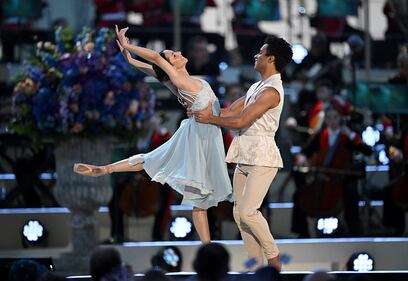 Coronation concert WINDSOR, ENGLAND - MAY 07: Marcelino Sambe and Francesca Hayward perform on stage during the Coronation Concert on May 07, 2023 in Windsor, England. The Windsor Castle Concert is part of the celebrations of the Coronation of Charles III and his wife, Camilla, as King and Queen of the United Kingdom of Great Britain and Northern Ireland, and the other Commonwealth realms that took place at Westminster Abbey yesterday. High-profile performers will entertain members of the royal family and 20,000 guests including 10,000 members of the public. (Photo by Leon Neal/Getty Images) (LEON NEAL/Leon Neal/Getty Images)
