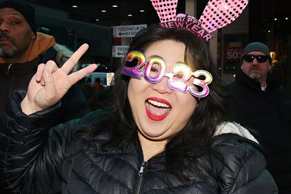 New Year's Eve preparations NEW YORK, NEW YORK - DECEMBER 20: A person wearing 2023 glasses attends as the “2023” numerals arrive in Times Square on December 20, 2022 in New York City. (Photo by Cindy Ord/Getty Images) (Cindy Ord/Getty Images)