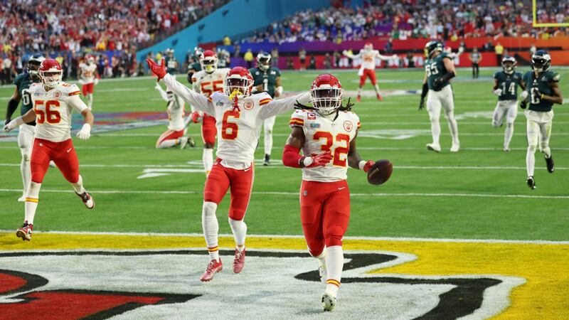 While the game promised to be a shootout, Kansas City’s defense tied the game midway through the second quarter. Hurts fumbled when he was hit near midfield and Chiefs linebacker Nick Bolton scooped up the loose ball, rumbling 36 yards for a touchdown with 9:39 before halftime.