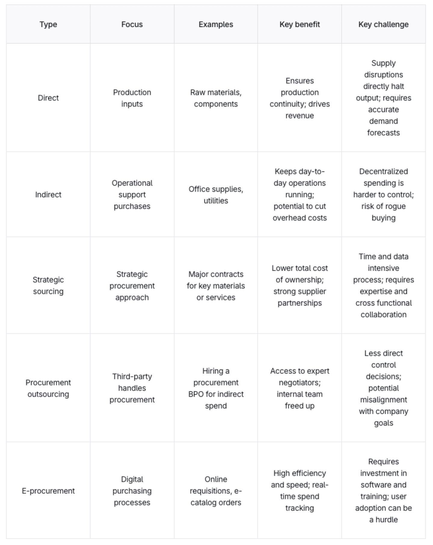 Procurement can be classified in several ways. Broadly, it can refer to what is being purchased, such as direct versus indirect procurement, as well as how the procurement process flow is carried out through methods like strategic sourcing, outsourcing, or electronic systems. We explore the main types of procurement in detail below, including their definitions, examples, challenges, and best practices.