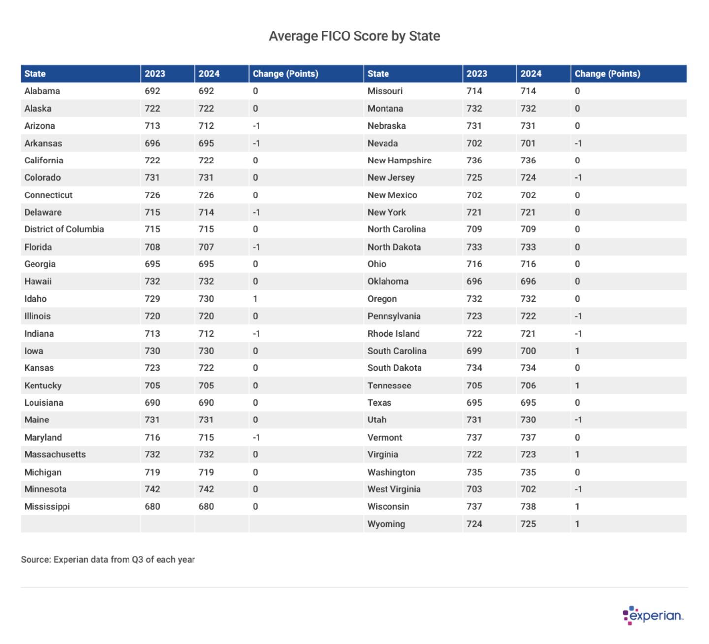 Nationwide, Experian noted no change in the average FICO Score, which held steady at 715 through the 12 months ending September 2024.