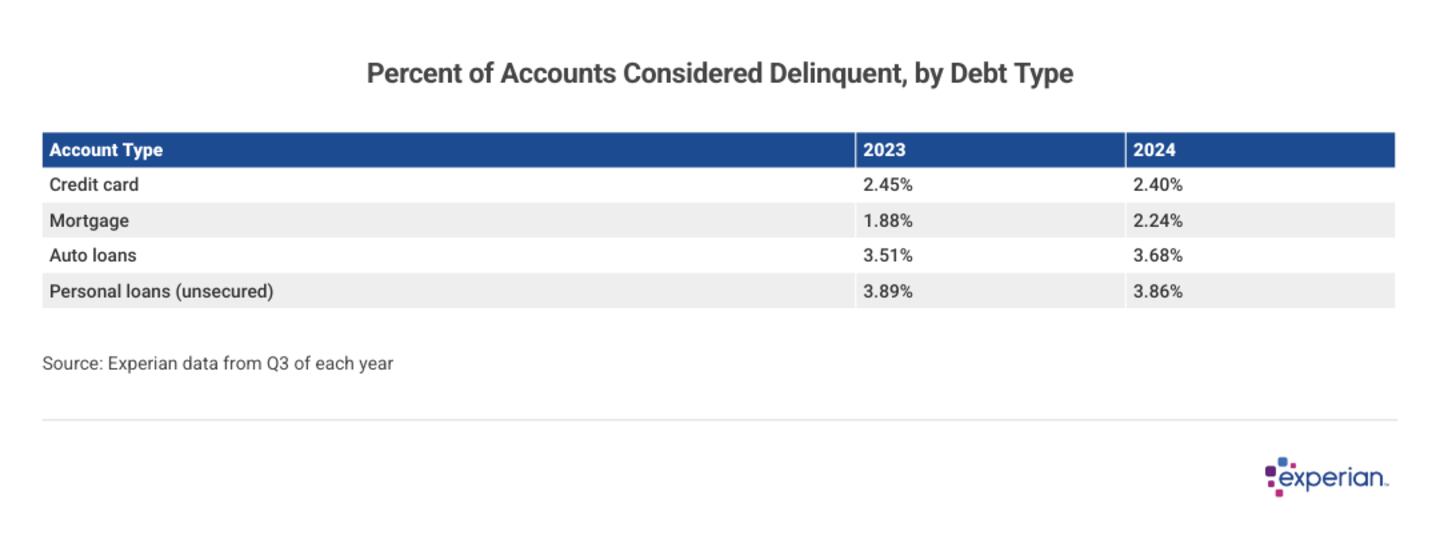 Now that economic activity has normalized, relatively speaking, so have the derogatory marks on credit reports that can drastically reduce FICO Scores. As of Q3 2024, 2.40% of credit card accounts were 30 or more days past due, according to Experian data. That's slightly lower than Q3 2023, when 2.45% of accounts were at least 30 days delinquent.