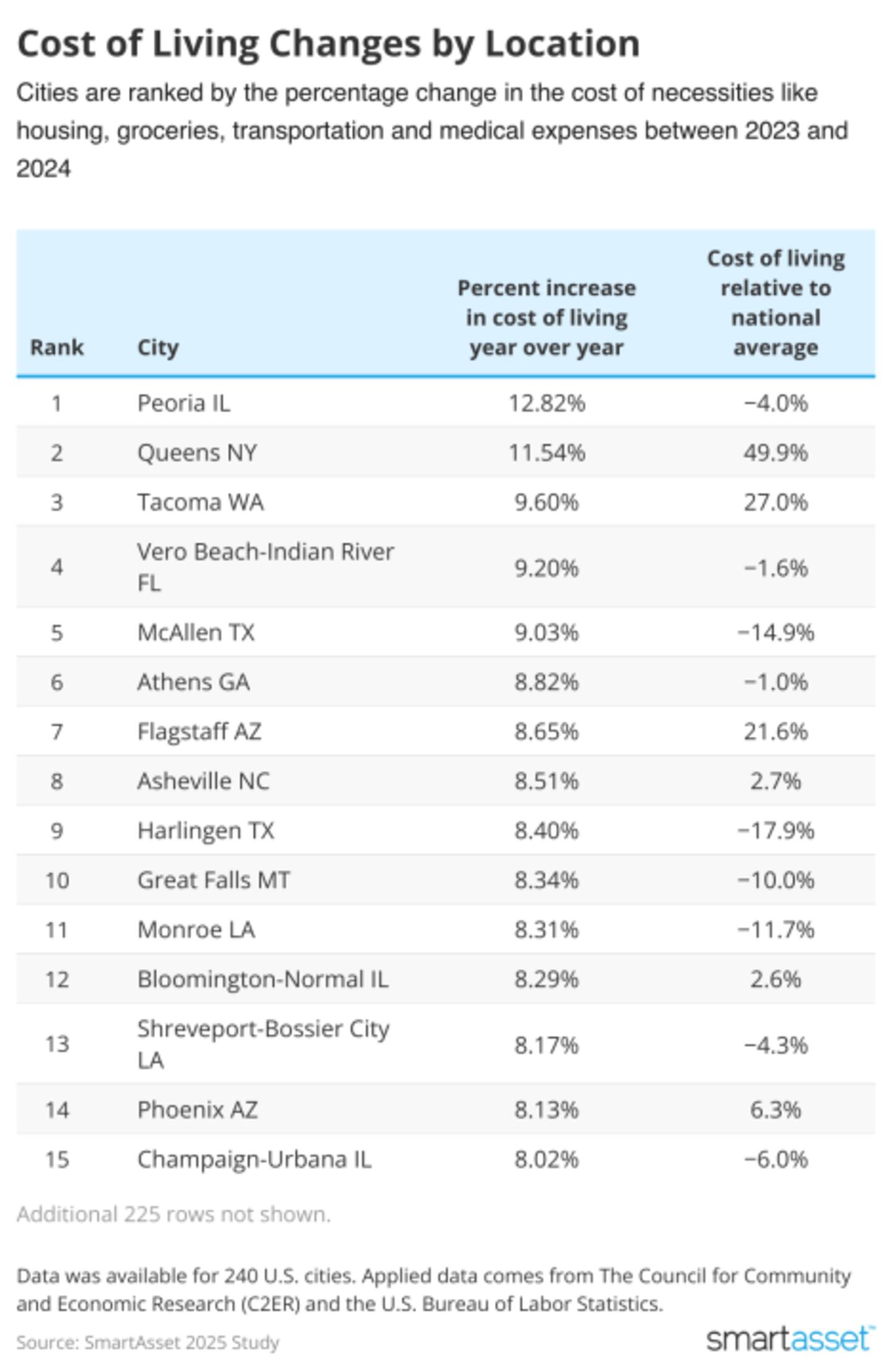 - The cost of living increased by over 10% in these two cities. Peoria, Illinois, saw the highest increase in cost of living at 12.8%. Peoria previously enjoyed a significantly lower cost of living than average, but those costs are quickly rising. Queens, New York, also saw an 11.5% increase in the cost of living, which now makes it about 50% more expensive than the average U.S. city.