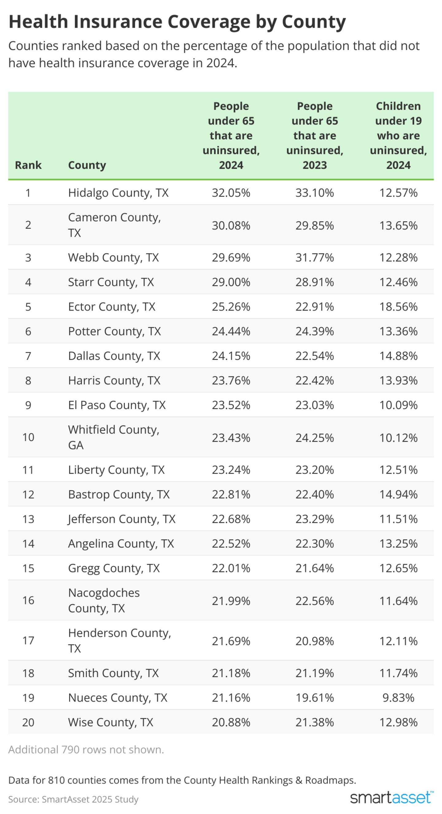 - These Texas counties have the lowest rates of health insurance coverage nationwide. More than any other county, 32% of residents in Hidalgo County don't have health insurance. Cameron County (30.1% uninsured), Webb County (29.7%), Starr County (29%), Ector County (25.3%), Potter County (24.4%), Dallas County (24.2%), Harris County (23.8%), and El Paso County (23.5%) are also among the top 10 uninsured counties nationwide.