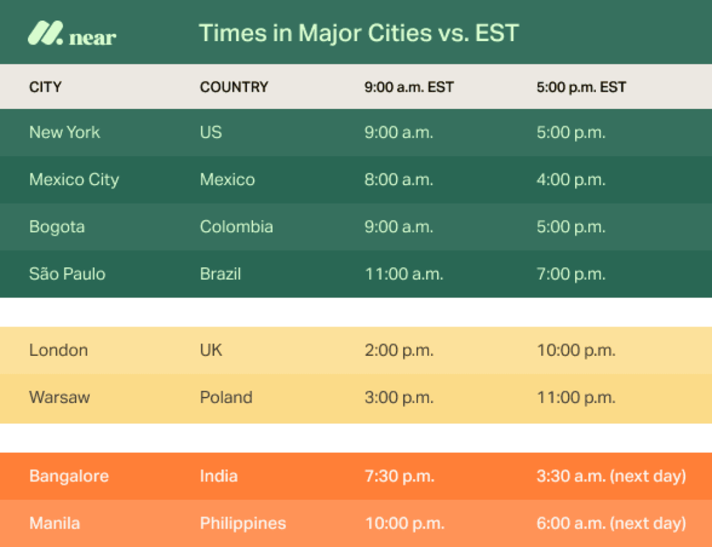 The Harvard study found that the optimal arrangement for synchronous communication was to have teams located “on a North–South axis.” So, for example, although New York and São Paulo are geographically distant, “workers in each location pair will experience near-complete [business-hours overlap].”