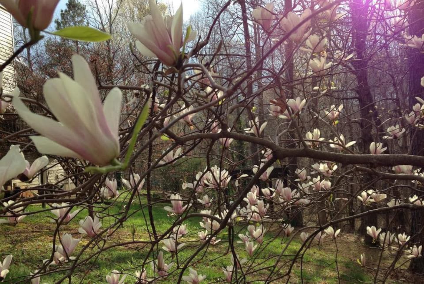 Star magnolia is a deciduous shrub or small tree with white, papery looking flowers, with slender petals. It typically opens a week or so ahead of saucer magnolias. These can be white or purple in color. Edgeworthia, a large shrub, sports yellowish-white, very fragrant blooms now too.