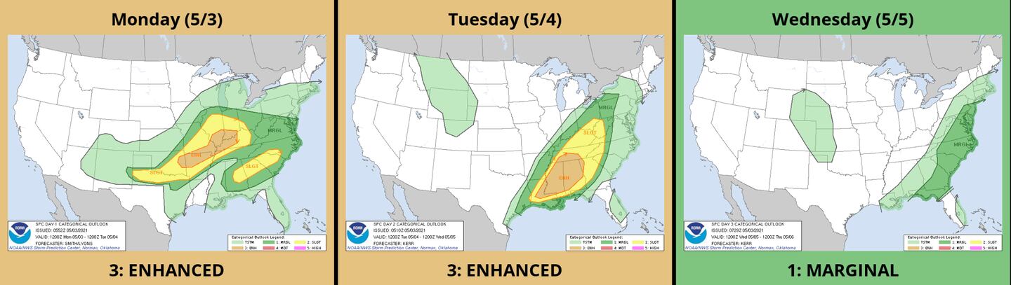 A series of fronts and upper-level disturbances will bring waves of scattered showers and thunderstorms the next 3 days, some heavy or strong with some severe weather in the mix along the way.
