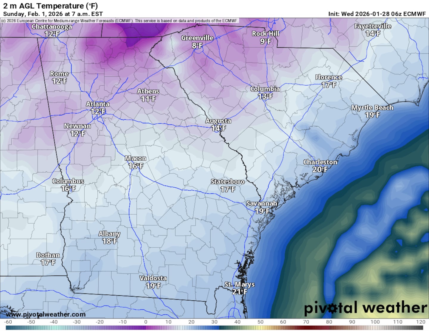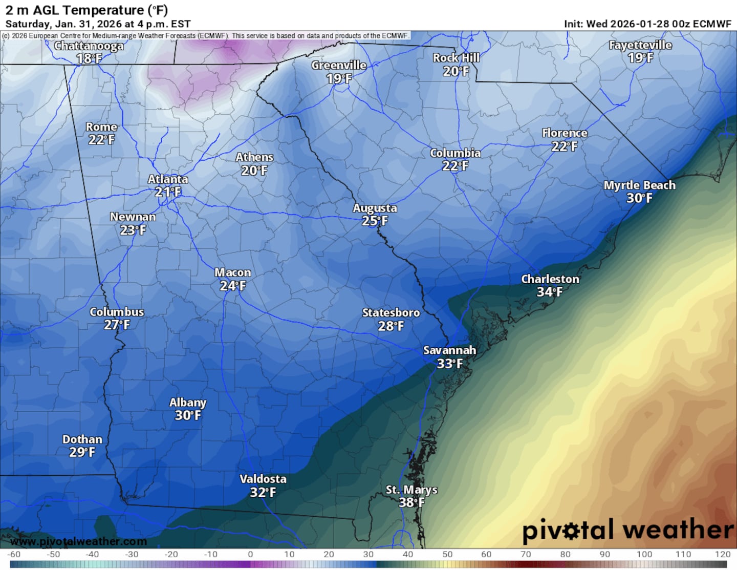 Cold air will tumble into North Georgia early Saturday morning, and by Saturday afternoon, actual temperatures will be limited to the mid to upper 20s.