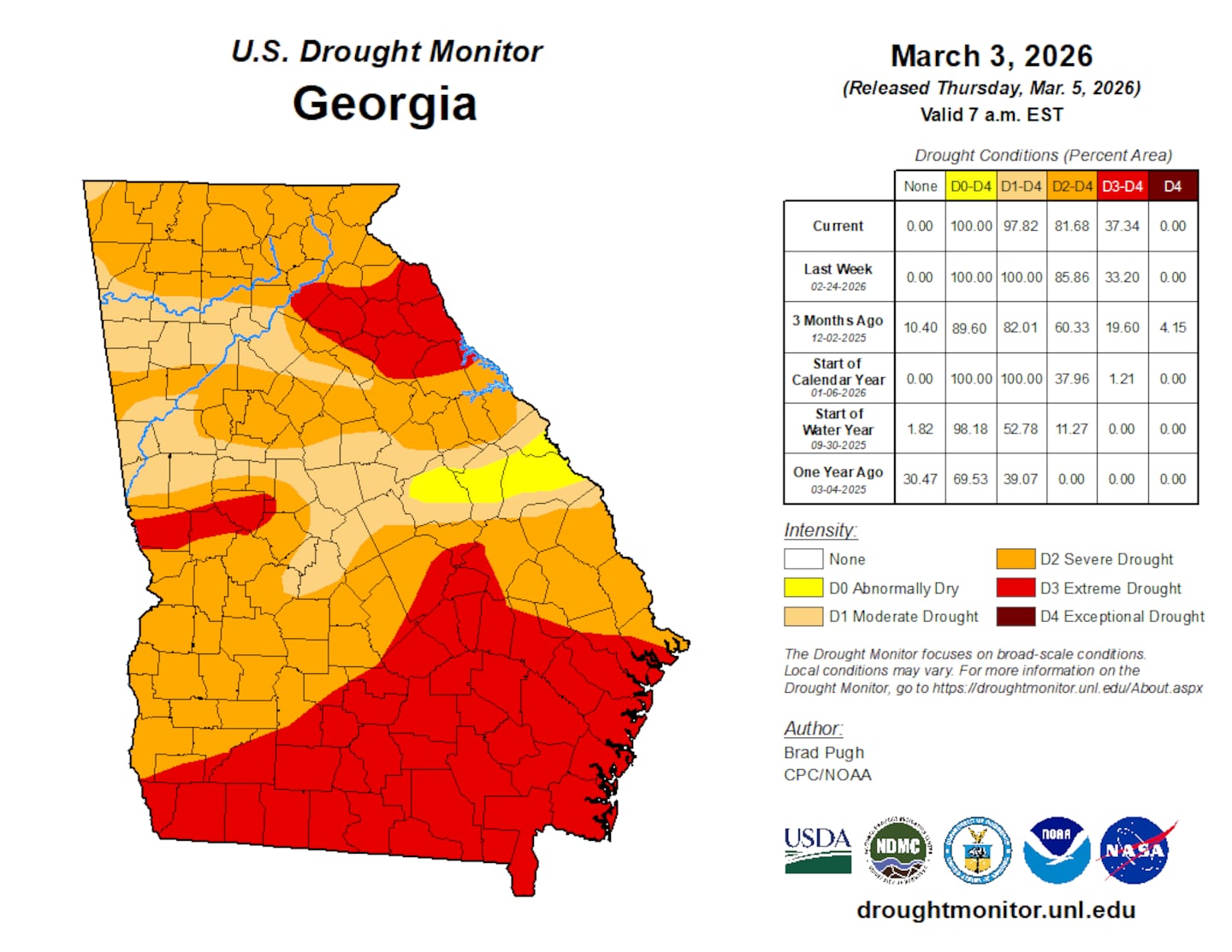 Before the rain arrived, Extreme Drought (D3) conditions developed in Athens and spread west towards Barrow County.
