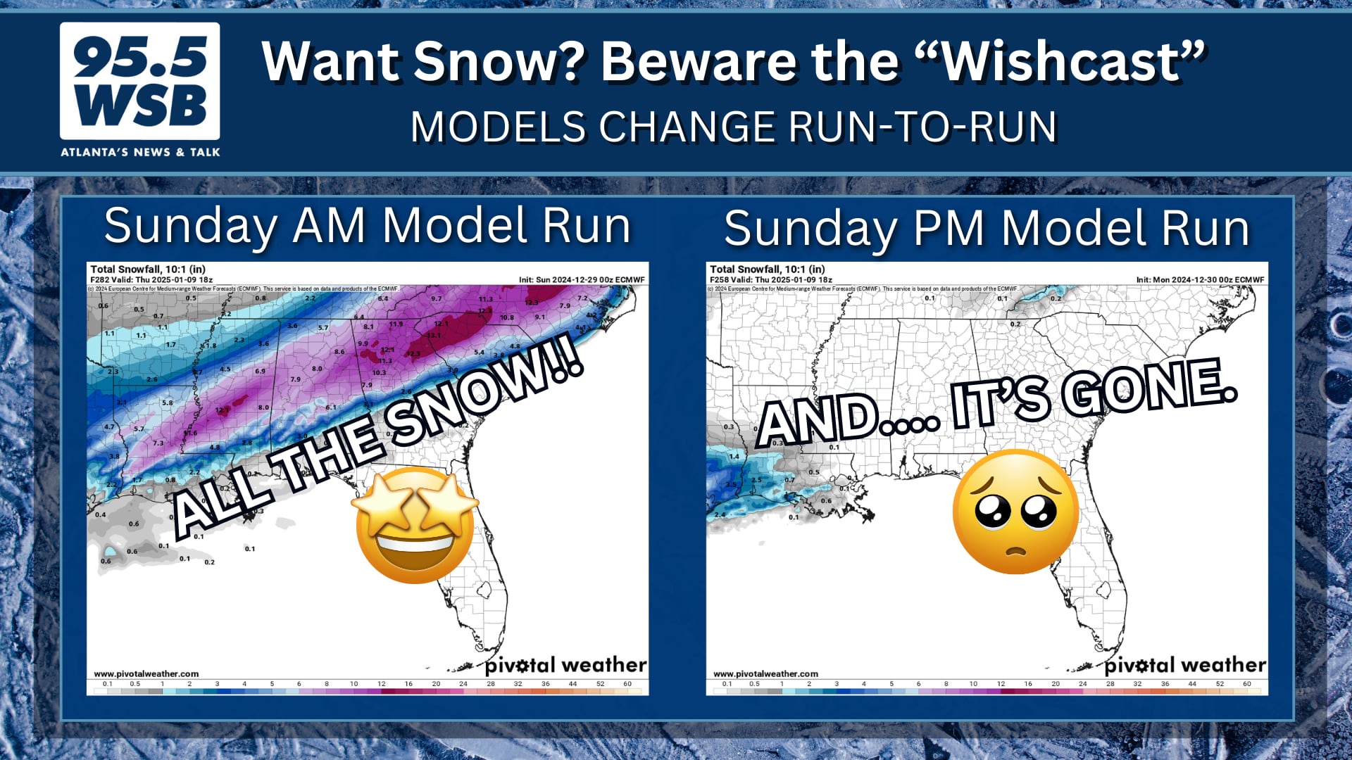 I saw “that snowcast” post that went viral Sunday afternoon, in which a few social media accounts found one single deterministic run of the ECMWF showing 12 inches of snow for Metro Atlanta.