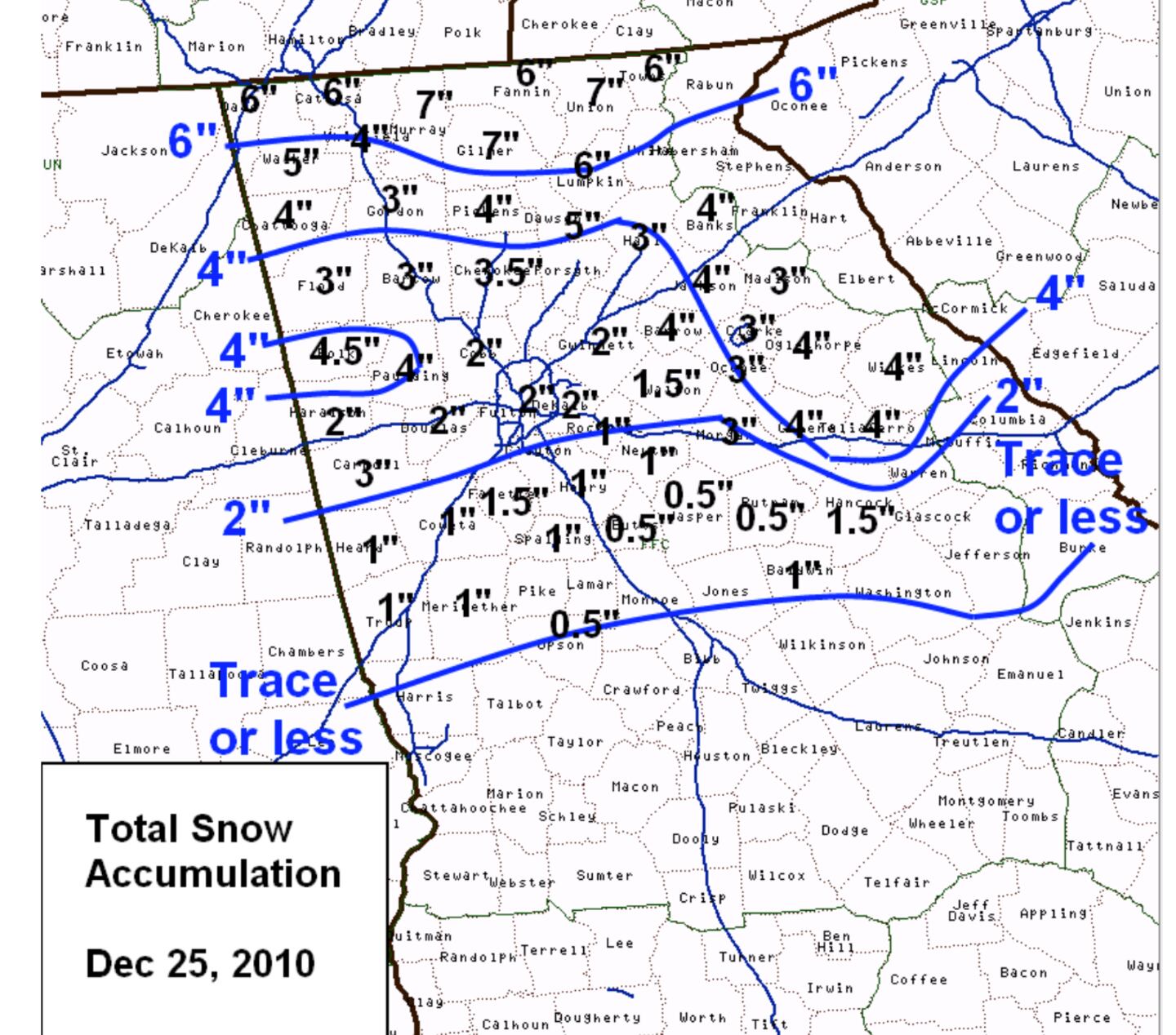 Atlanta Metro area saw between 1-3 inches - the first measurable snow on Christmas Day since 1881, snow is very rare in Georgia in December.