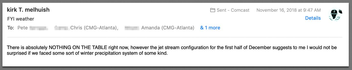 So I DO NOT see snow for Atlanta and probably not for all of Georgia through at least December 7th. Beyond that is more uncertain but I do not buy the model output as of now.