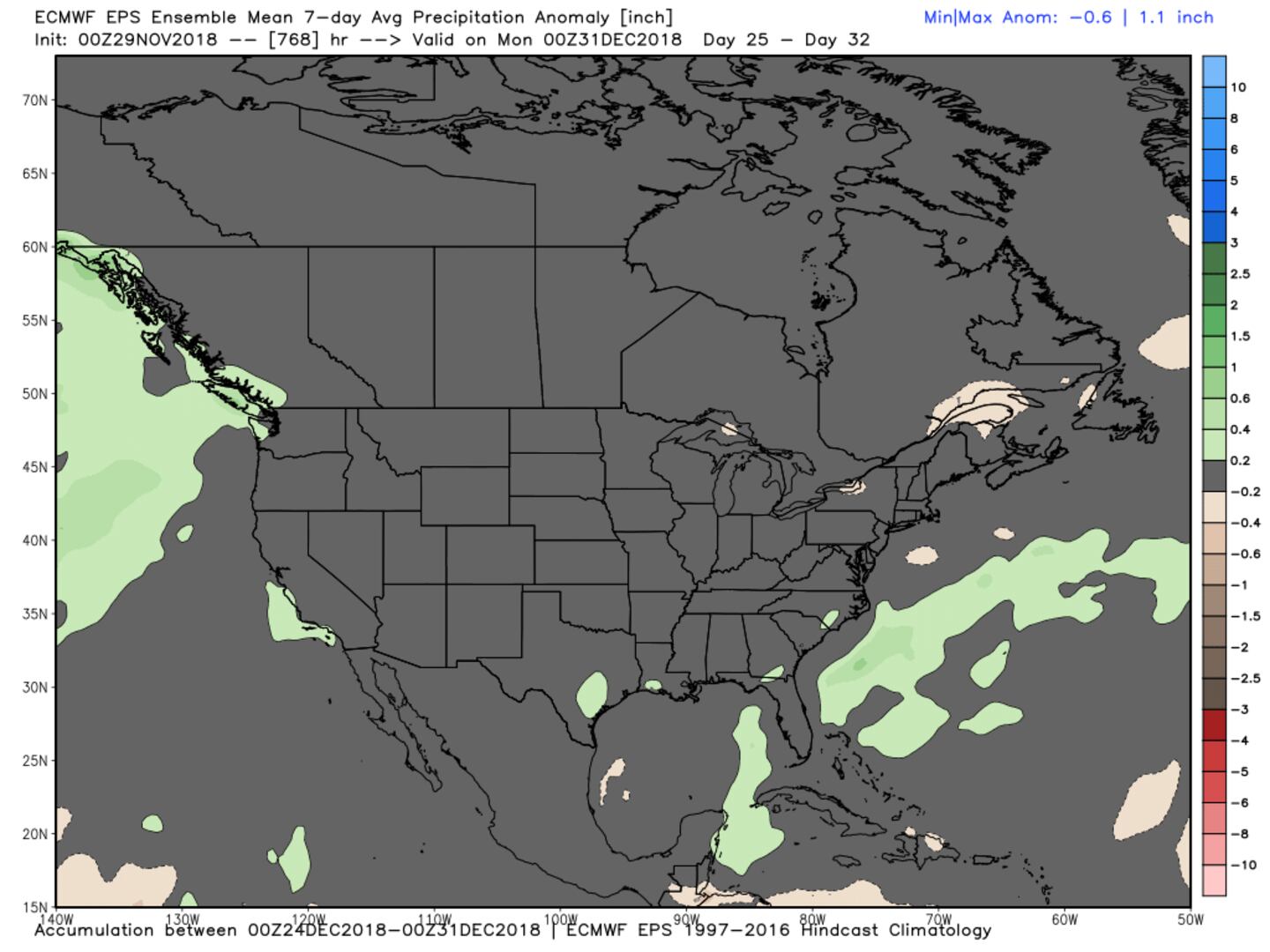The map above is the American GFS Ensemble snow forecast to December 7th. The map below is the European Ensemble model snowfall anomaly forecast to December 13th showing in green where snow amounts are projected above-normal (it looks right to me):