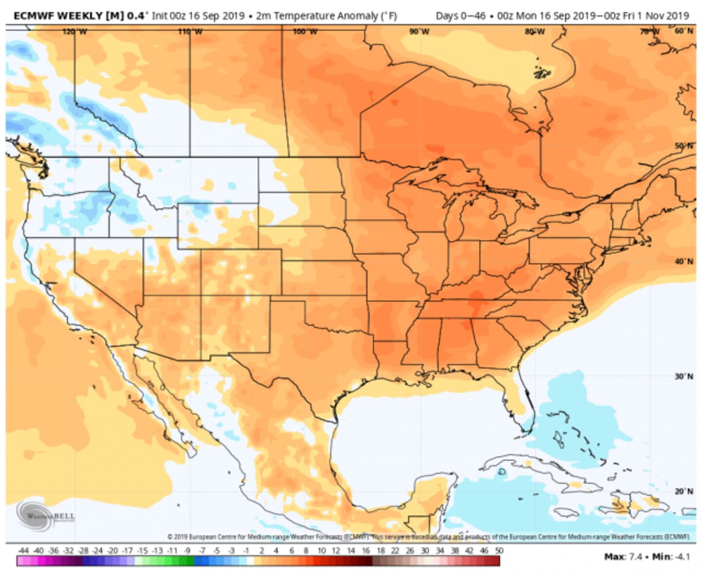 Remember that is the average of a 46 day period not every day or every week. The same for the CFSv2 model below which is cooler, but both models show below-normal rainfall.