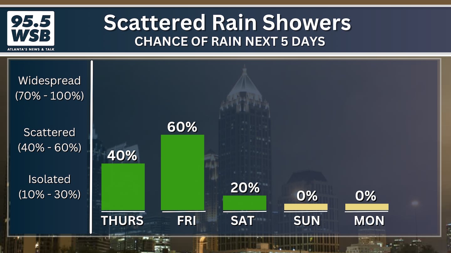 Friday’s rain showers will be more widespread across the Metro Atlanta area, and they will move through the region during the morning commute.