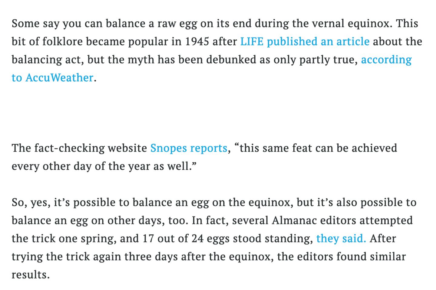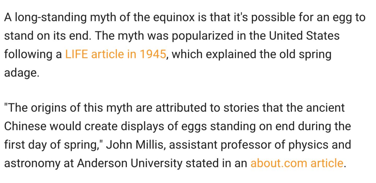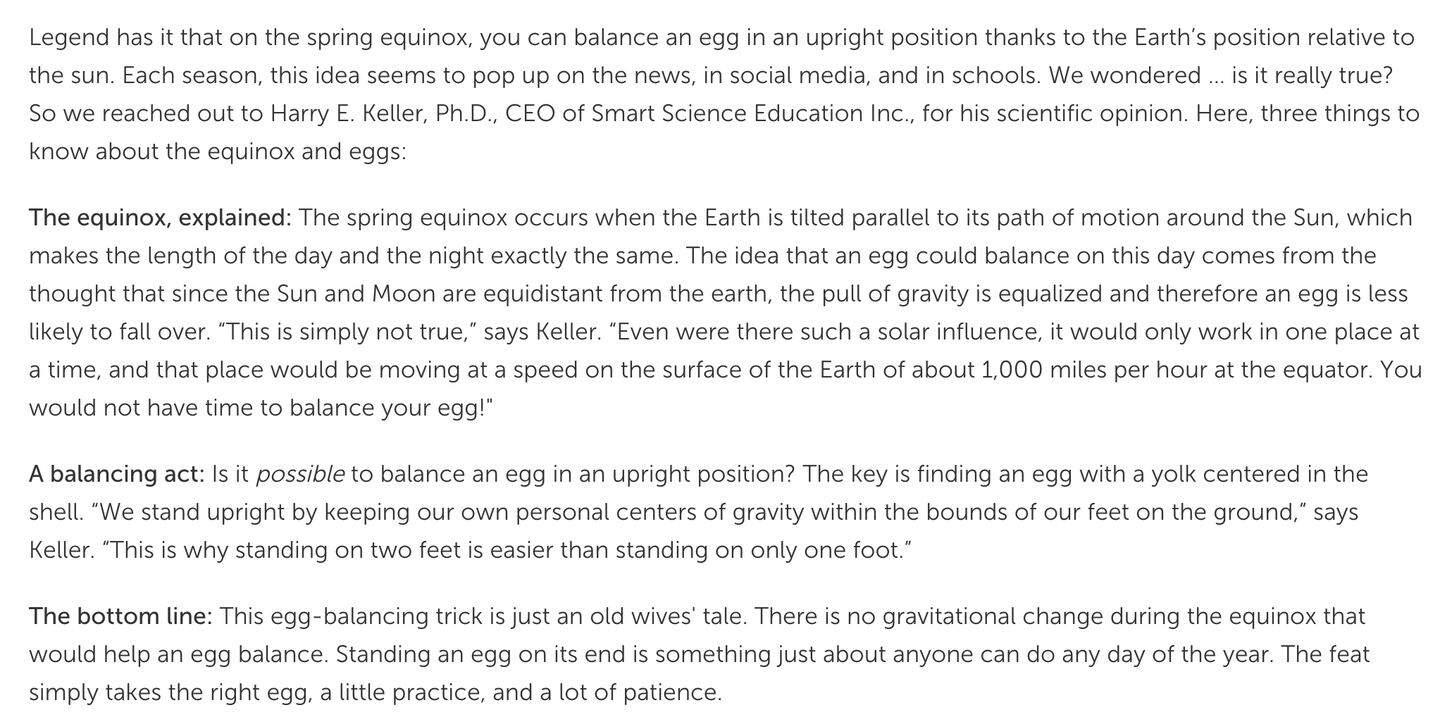 Experiments going back at least as far as 1984 have shown the egg and broom standing myth on the equinox is in fact just a myth, gravity doesn’t work that way.