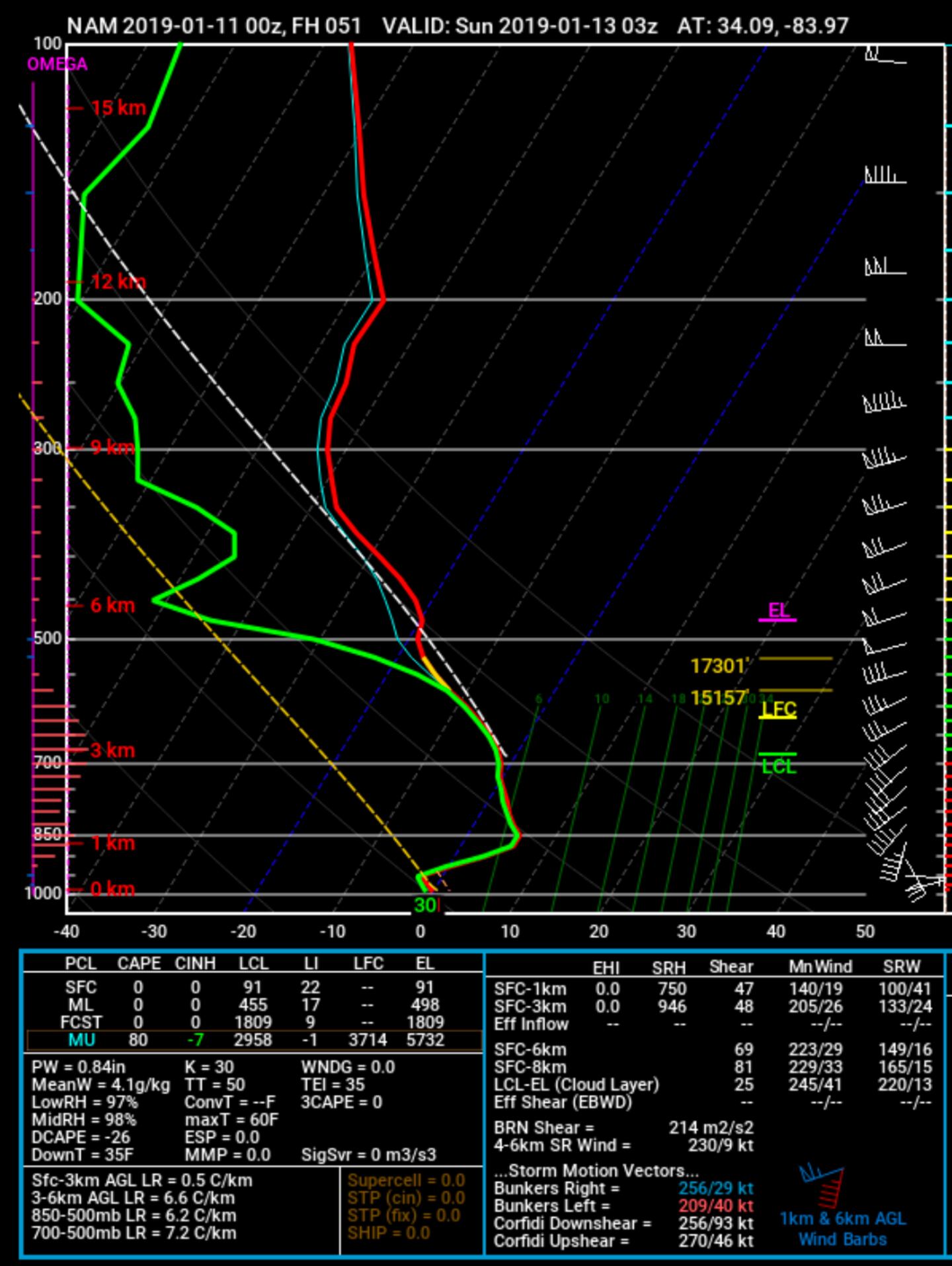 See the PivotalWeather Forecast Skew-T thermodynamic diagram sounding profile Pickens to Lumpkin to North Gwinnett Counties Saturday night (riding the line):