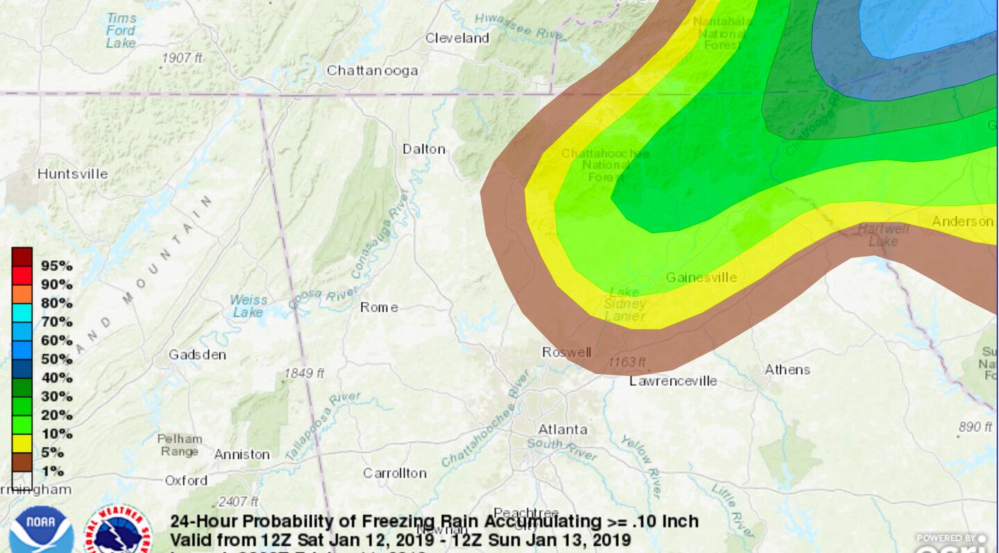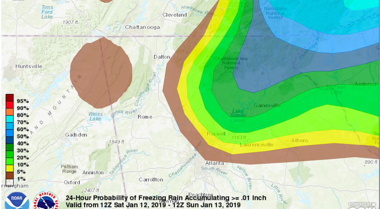 For the Far Northern and Northeast Georgia mountains a dusting of snow and a tenth inch of ice before changing over to just rain Sunday afternoon and evening.