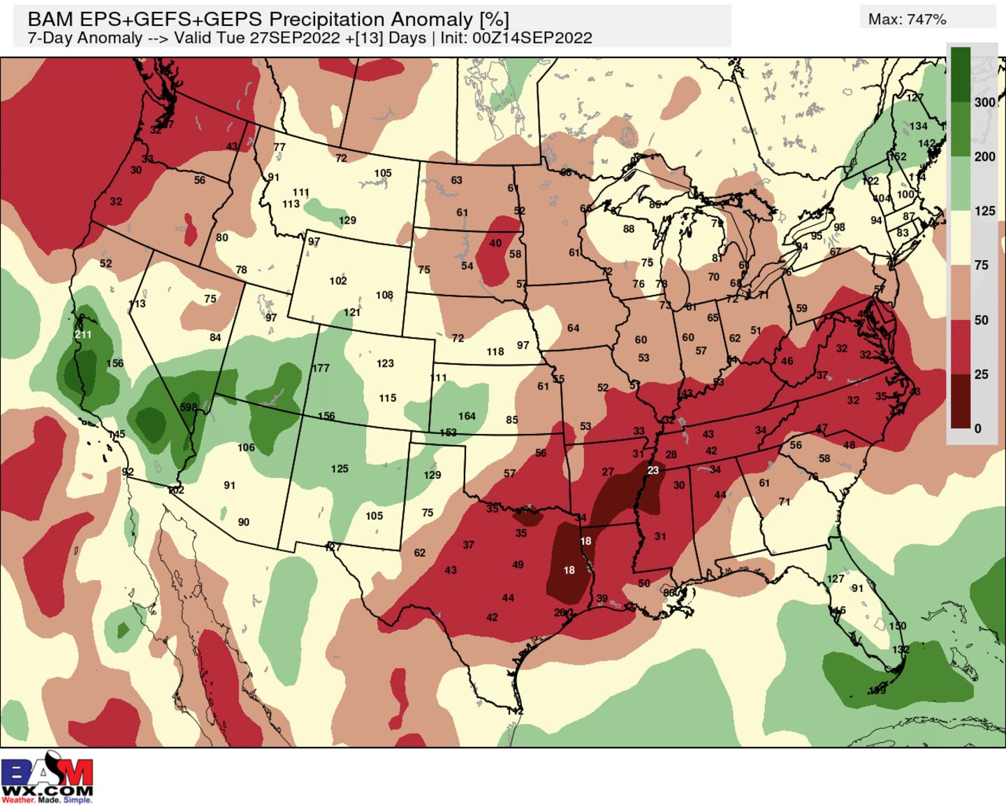 ENSEMBLE 3 MODEL BLEND RAIN % DEPARTURE FROM NORMAL SEPTEMBER 21-27TH: