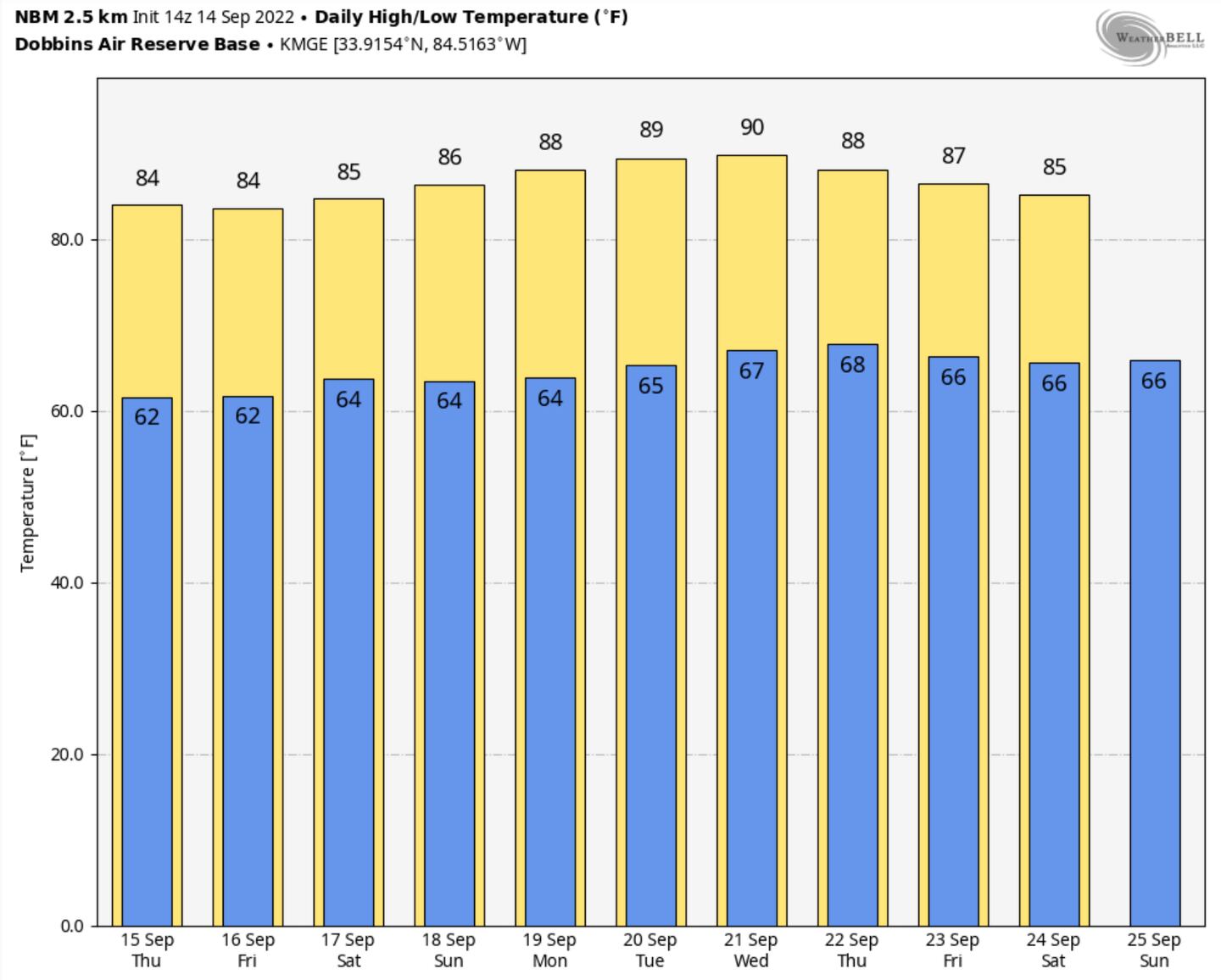 IF CORRECT this indicates a GRADUAL warming trend culminating in a CHANCE OF 90º in the extended medium range outlook around September 22nd give or take a couple days. The ECMWF ENSEMBLE probability guidance shown below indicates an 80-90% chance of a high of 90 sometime near this date.