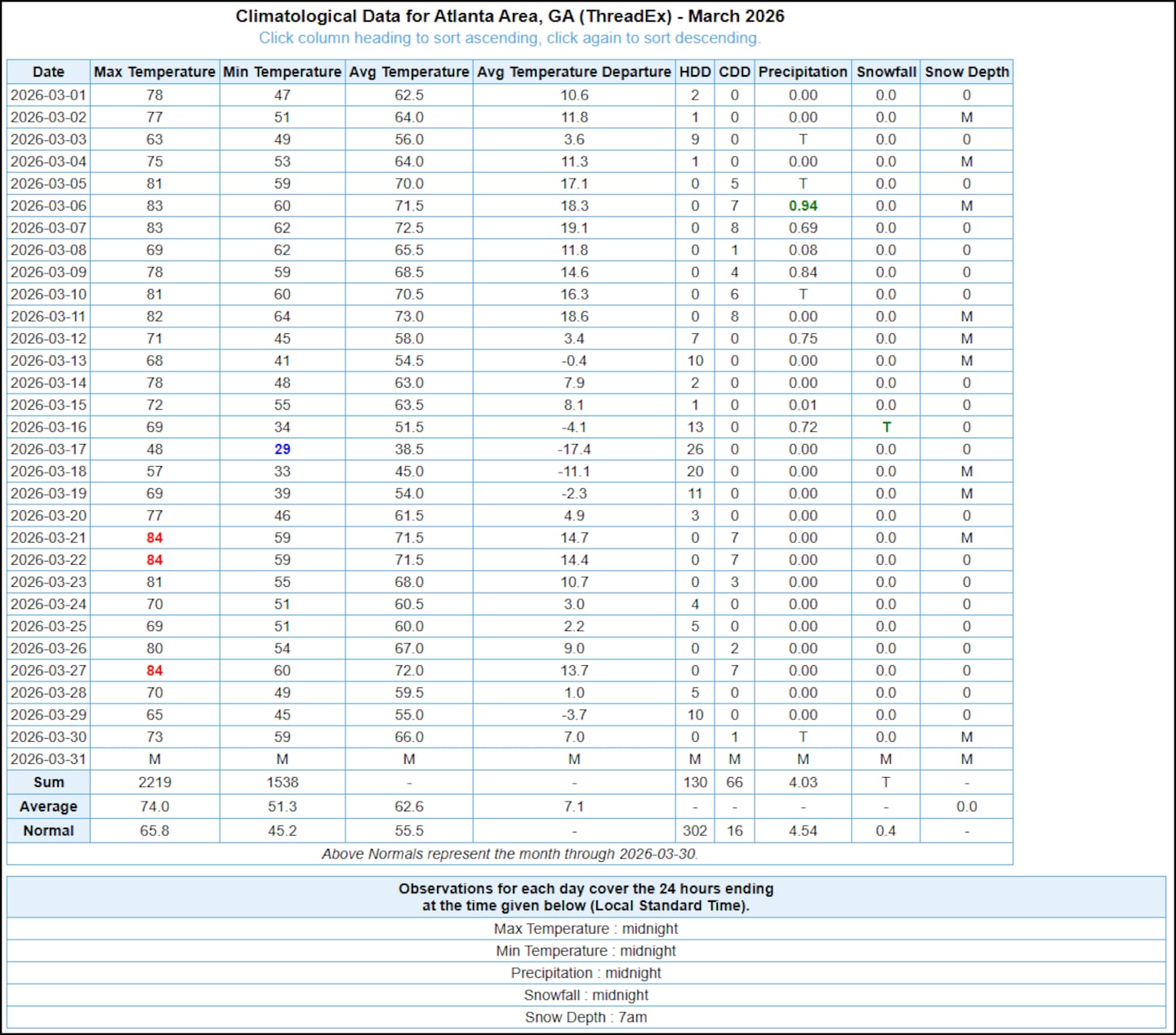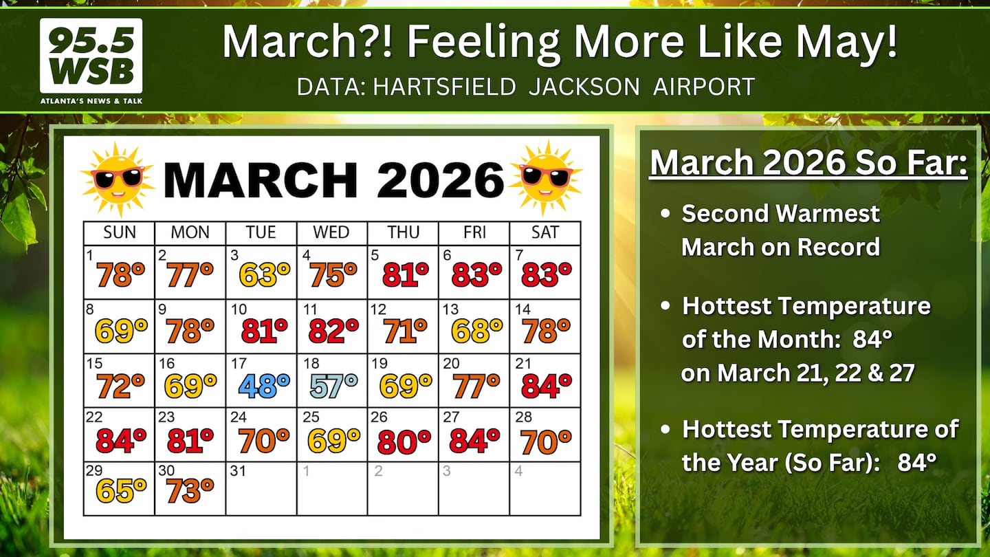 While the remaining official daily high temperature is yet to be recorded, it was evident as early as St. Patrick’s Day that March 2026 was shaping up to be the second warmest on record for the Metro Atlanta area.