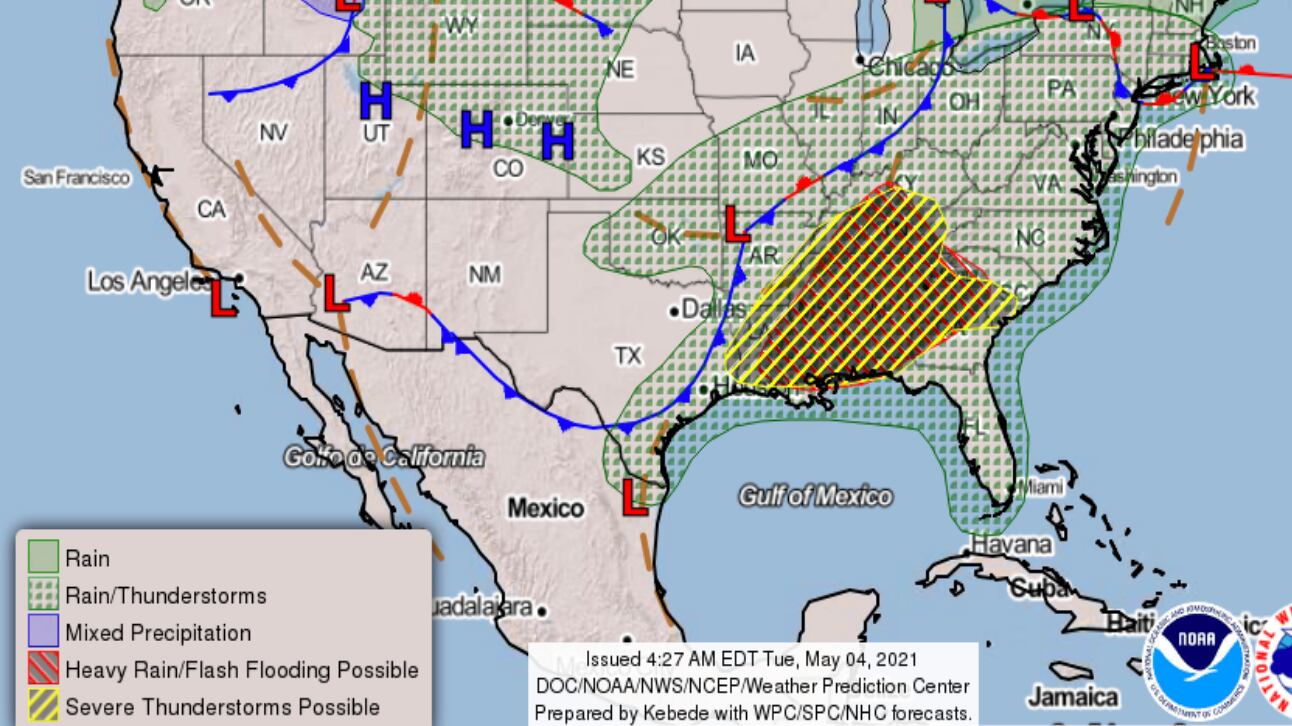 Notice below how the early expectation is for a concentration of rain and storms to the West and South of Metro Atlanta after the activity to our North fades. Often when that happens it can “rob” our area of some moisture instability and energy for widespread severe weather, keeping the worst of it in MS/AL (but no guarantees).