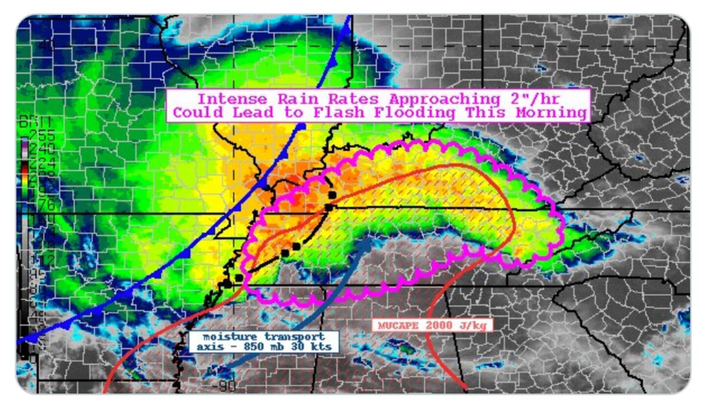 What might cause that not to work out this time is the outflow boundary from the overnight storms in Tennessee may move in here from the NW to SE with storms ahead of the approaching second area ahead of the front coming in from the West tonight: