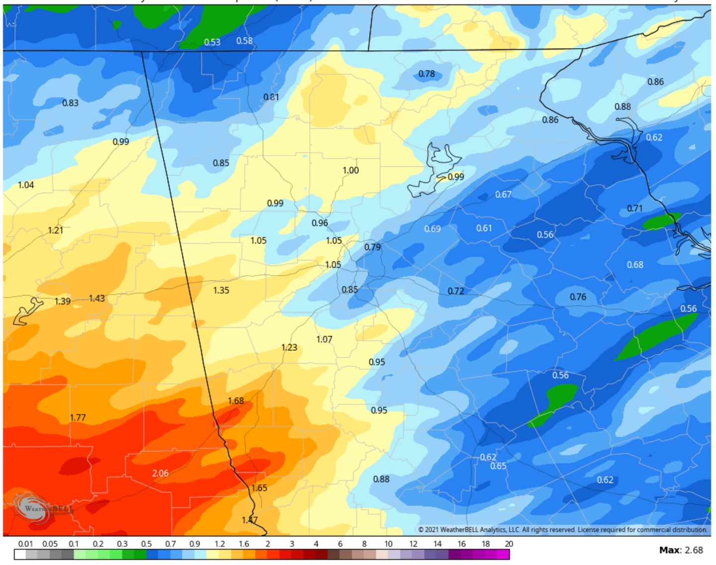 Notice below how the early expectation is for a concentration of rain and storms to the West and South of Metro Atlanta after the activity to our North fades. Often when that happens it can “rob” our area of some moisture instability and energy for widespread severe weather, keeping the worst of it in MS/AL (but no guarantees).