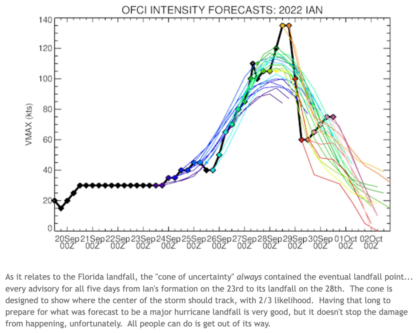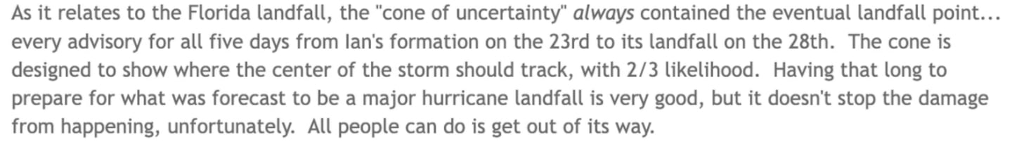 For days on end the National Hurricane Center (NHC) and every other meteorologist emphasised the higher than normal uncertainty in the final destination of the storms center but that a powerful dangerous strike on the West FL coast was likely. They and the media were accused of “hype” and “scare tactics” on social media for using phrases like “life-threatening, catastrophic, unsurvivable” etc.