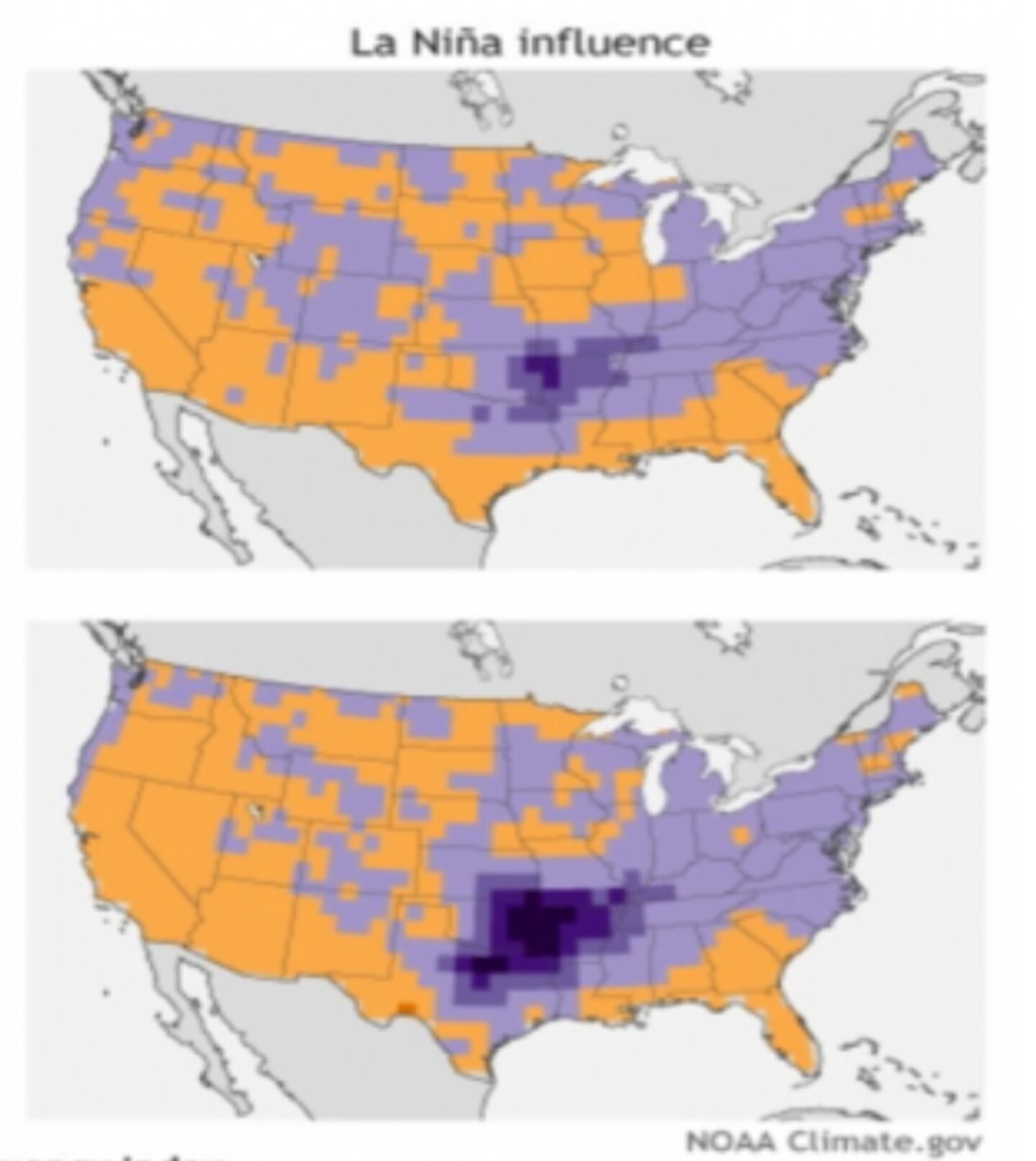 La Nina seasons often see an increase in severe weather above-normal especially just to the North and West of Atlanta with the max influence in frequency in the ArkLaTx region straddling the Mississippi River. Top panel is tornadoes and bottom panel is hailstorms March-April-May: