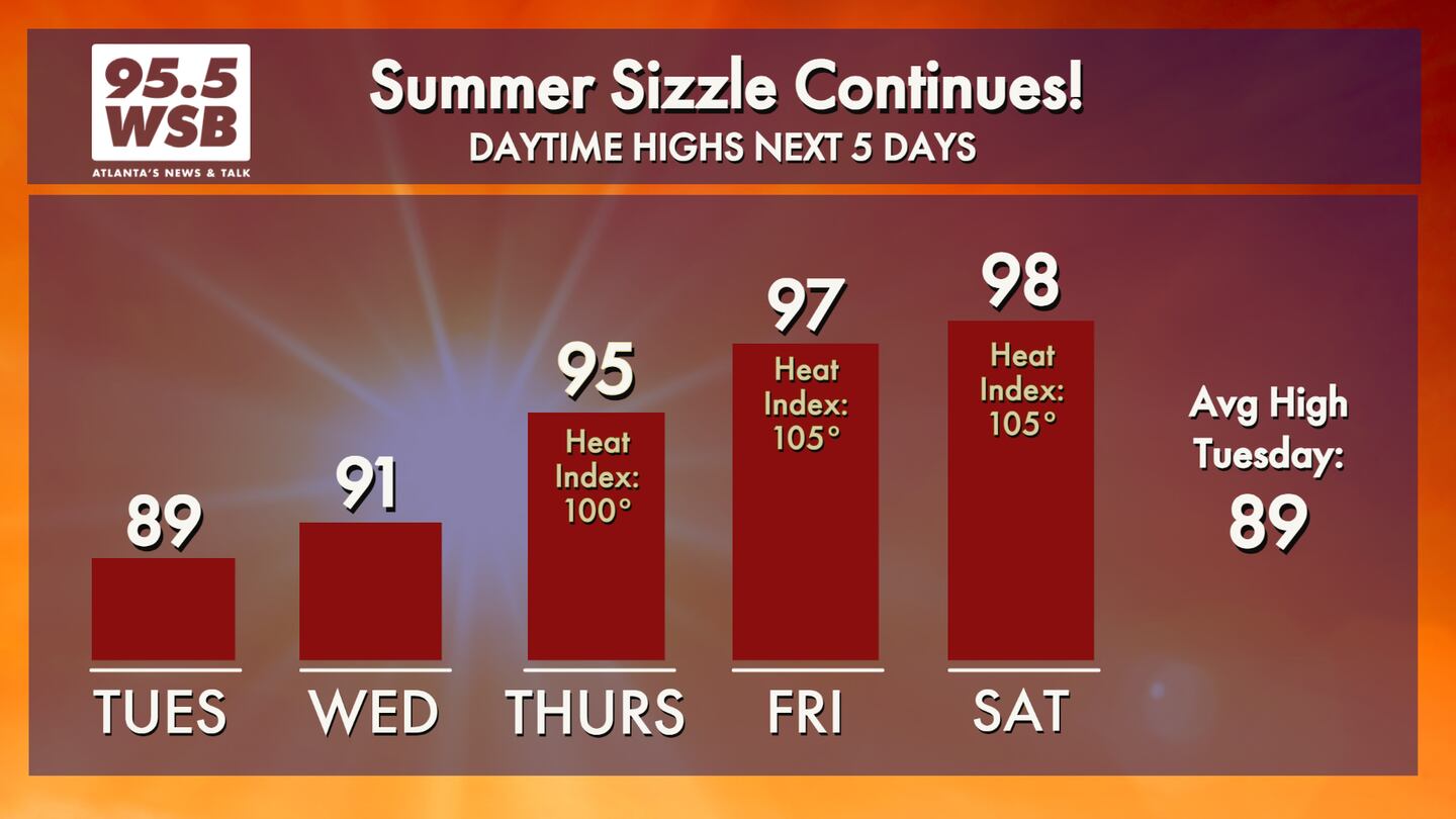 During the afternoons, the humidity will combine with the high temperatures to create stifling conditions, as “feels like” heat index values climb into the 100-105 range.