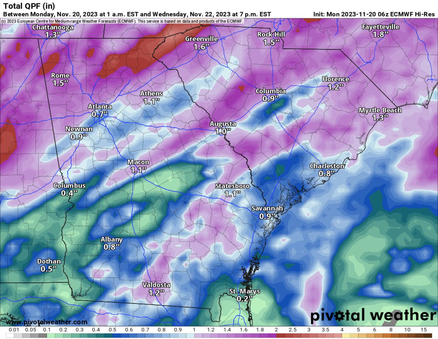 Below is the Futurecast ECMWF model rainfall data regarding the potential rainfall in North Georgia.