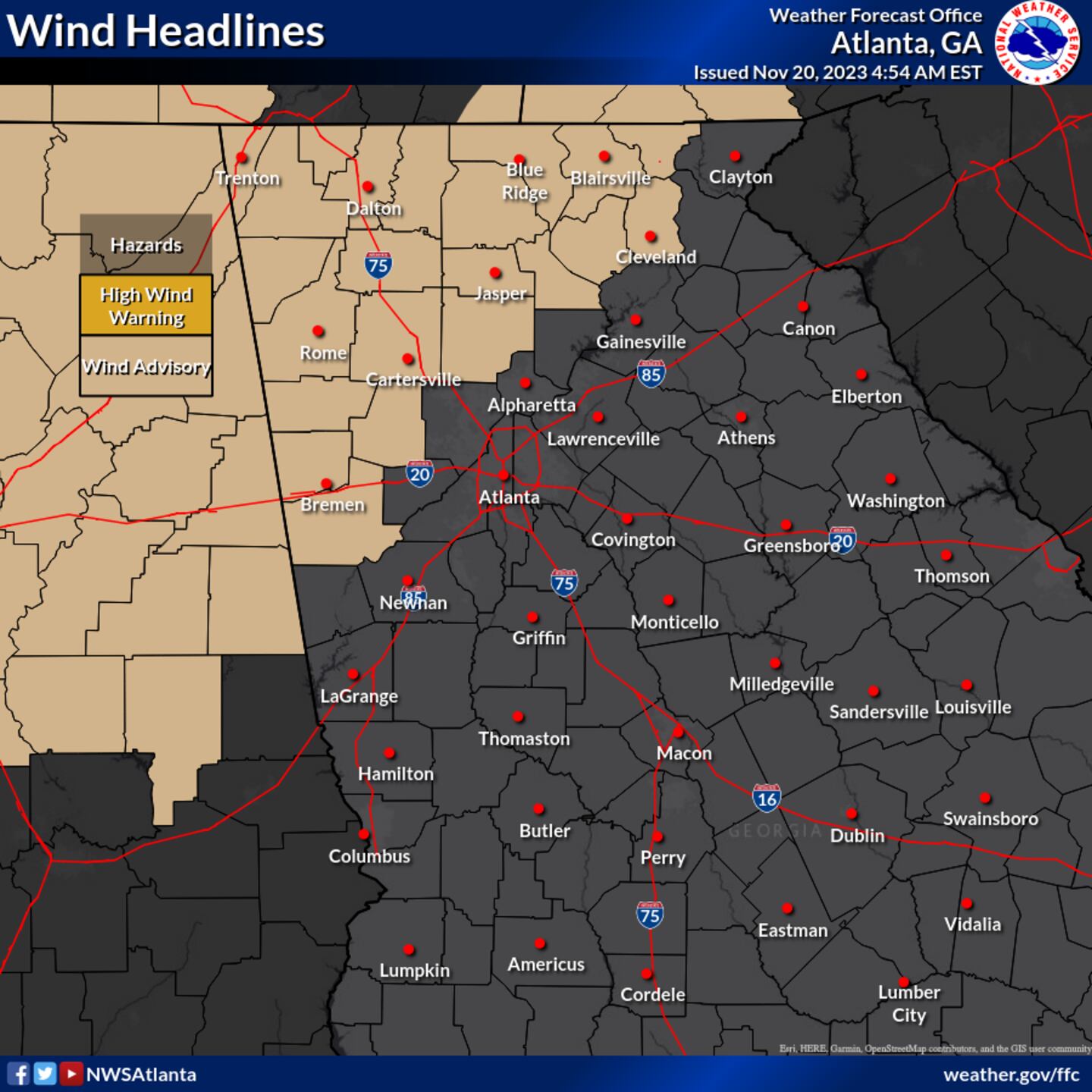 As a result, wind gusts as high as 35 to 45 mph are possible in Northwest Georgia, including Carroll, Paulding, Bartow, Cherokee and Pickens counties in Metro Atlanta. The Wind Advisory goes into effect at 7pm Monday through 1pm Tuesday.