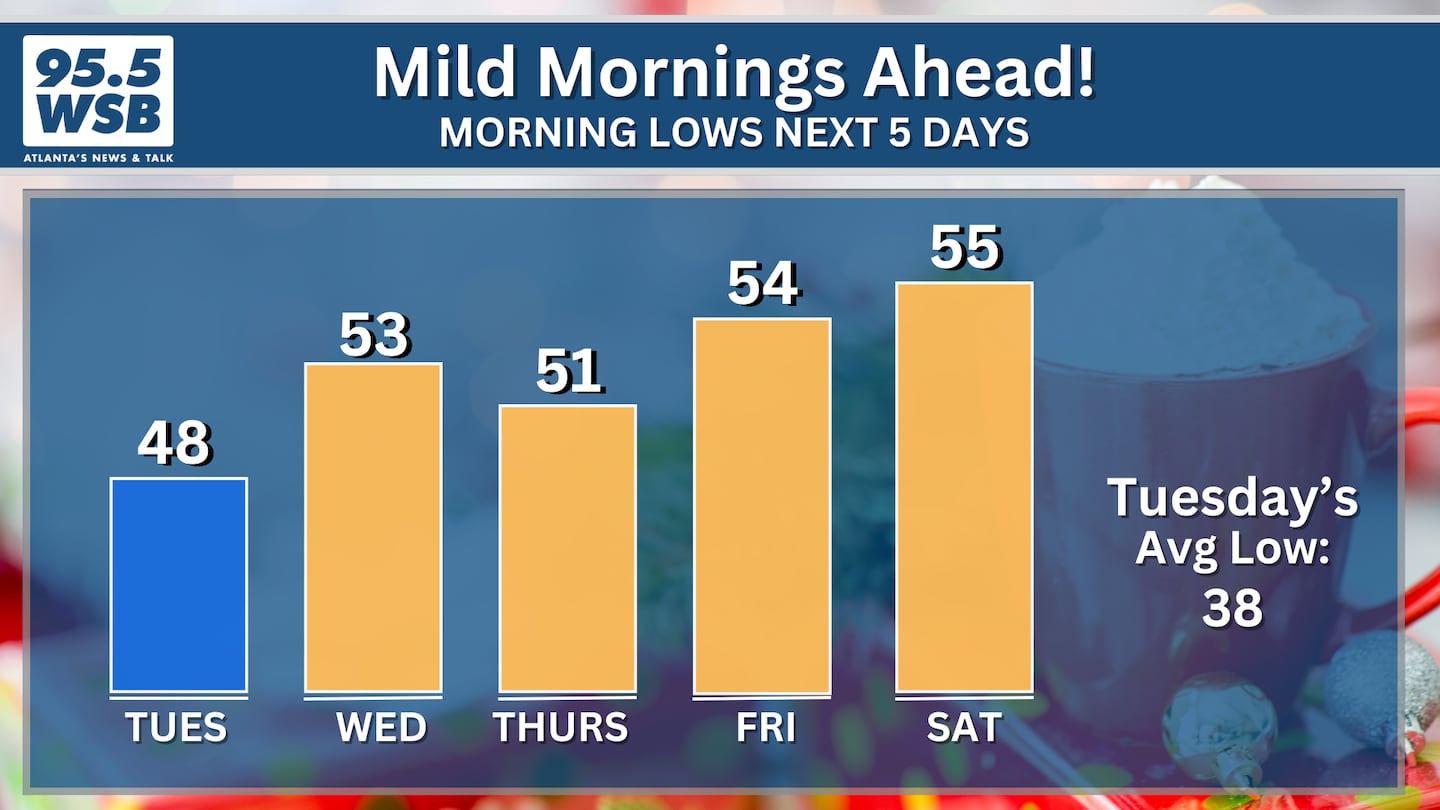 Morning lows will be quite mild as sunrise temperatures settle into the low to mid 50s. Instead of hot chocolate, an iced peppermint mocha may be a better idea!
