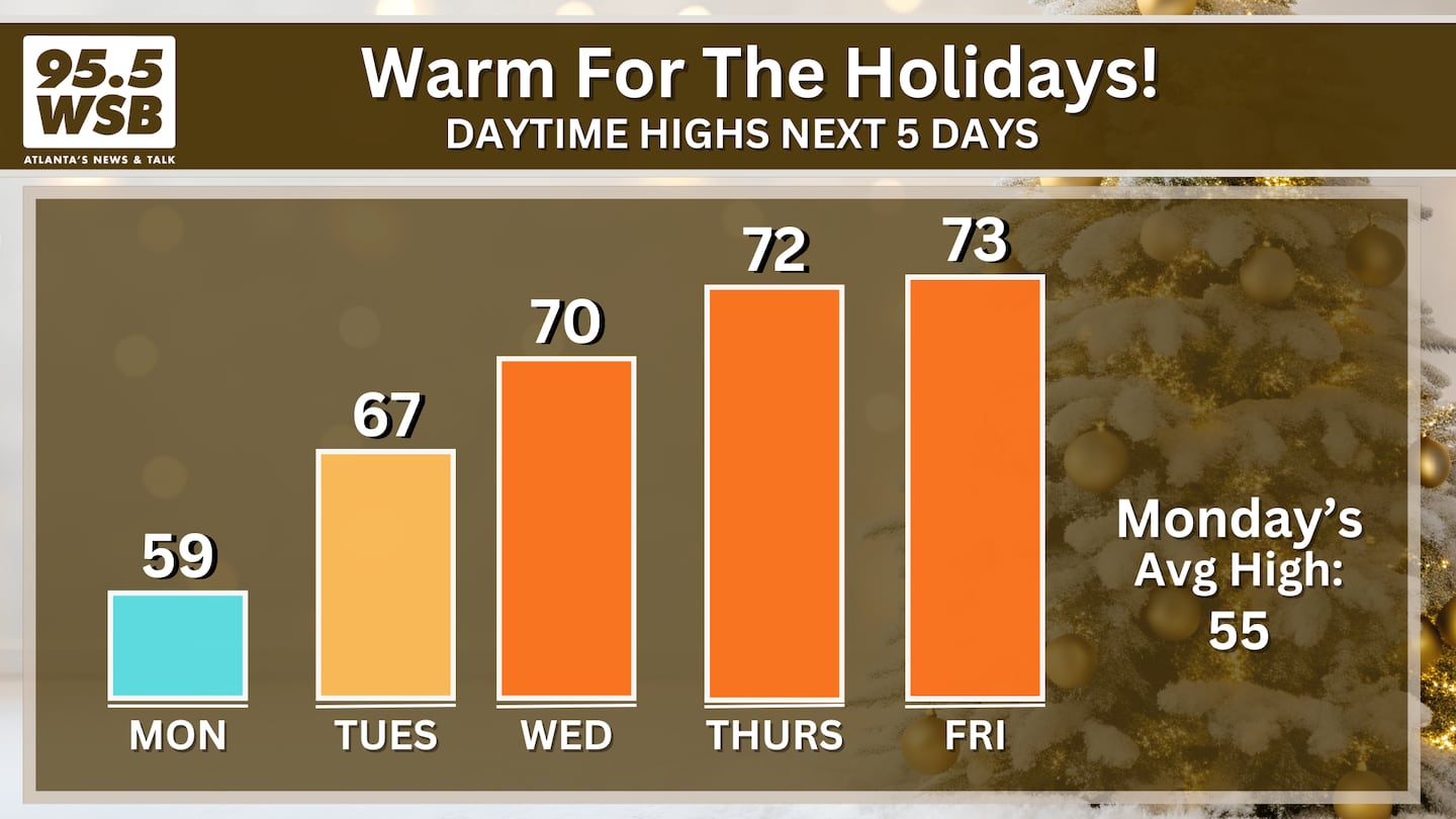 However, just in time for the Christmas Holiday travel week, temperatures will soar well above average, and Metro Atlanta may experience a Top 3 Warmest Christmas on record for the area.