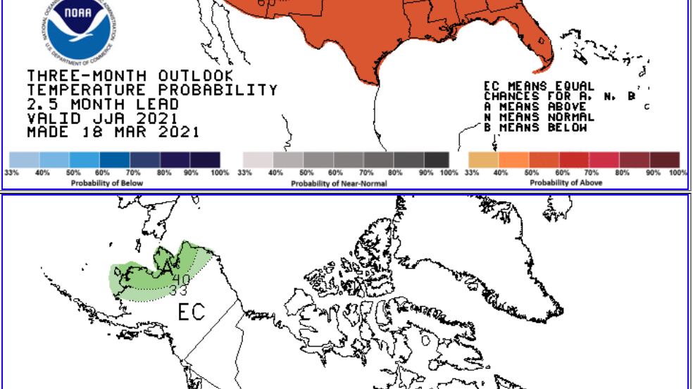 Much like my first “preliminary Spring and Summer outlook” issued at the start of March, it still looks like the greatest consensus for a long hot dry summer is in the center of the country with some extension in the West and Northern regions.
