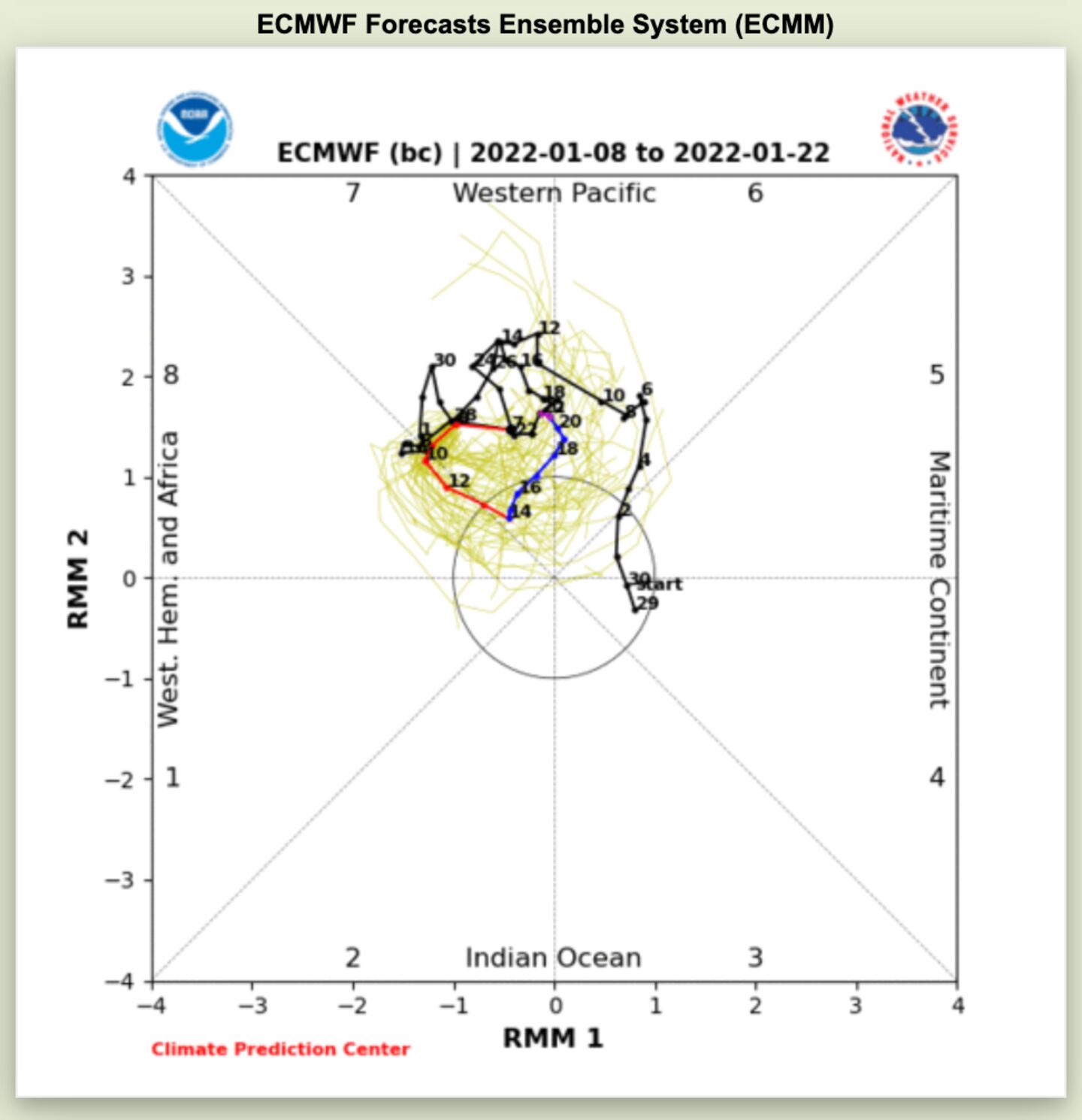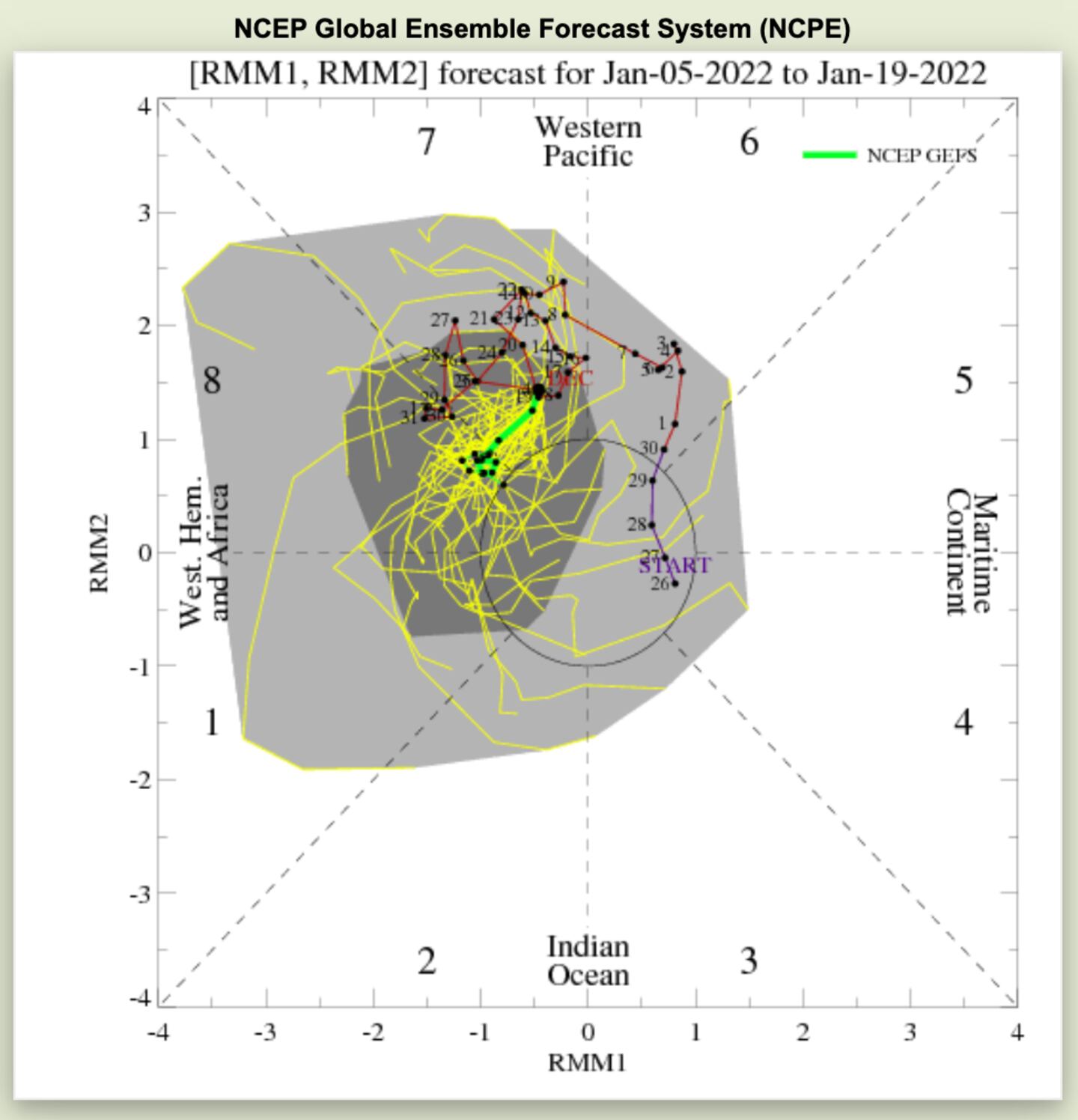 I’ve covered the MJO many times in the past. It (MJO=convection-thunderstorms/rising/sinking air over vast areas) impacts the jet stream pattern across the Northern Hemisphere including the tropics so is relevant to both tropical and extratropical cyclones. It’s phases run from 1-8. There are many different ways to track and depict it’s current and forecast state. I won’t show all of them here but I have shown many versions over many years.