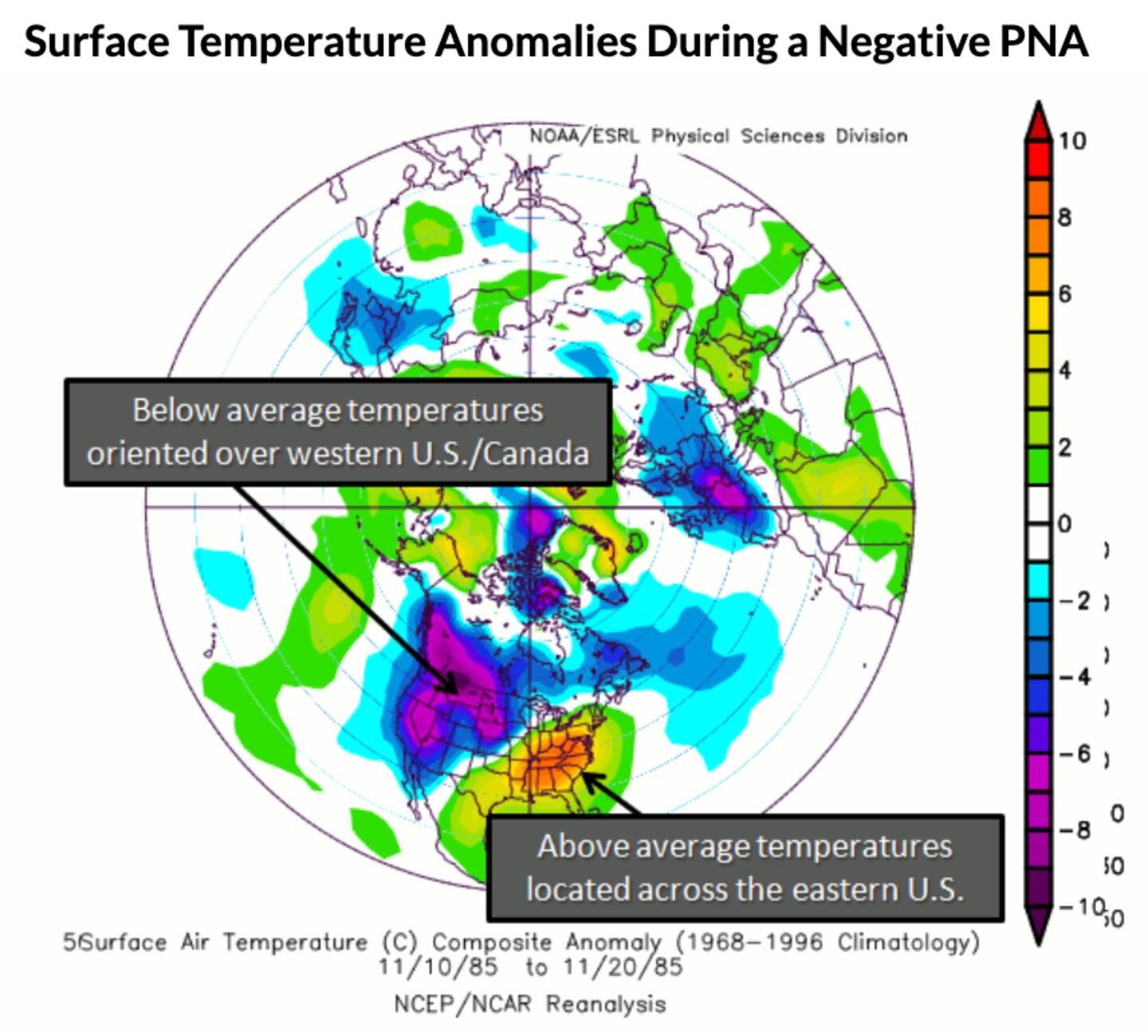 Our best odds for snow or ice come when we get a split flow jet stream pattern with cold air established followed by the approach of low pressure from the Southwest U.S. bringing “Over-running” precipitation with a “Miller A” type surface low track. These systems in the weeks ahead will ride more or less along the stalled polar front temperature gradient between the Southern edge of the cold air and the northern edge of the warmer air (blue vs yellow in U.S.)