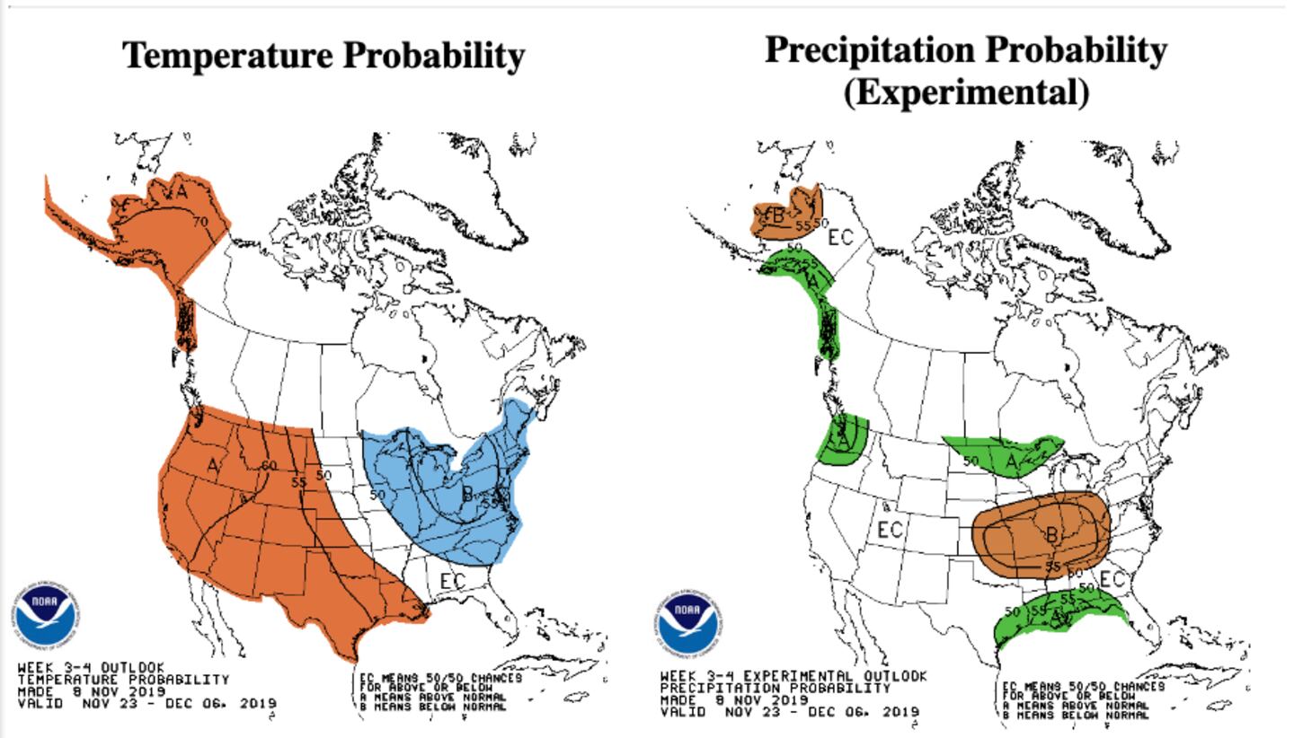 It’s way too early for a specific Thanksgiving forecast but early indicators point to a modest rain chance on or near Turkey day with temperatures in the mid 50s for highs with lows in the low to mid 40s.