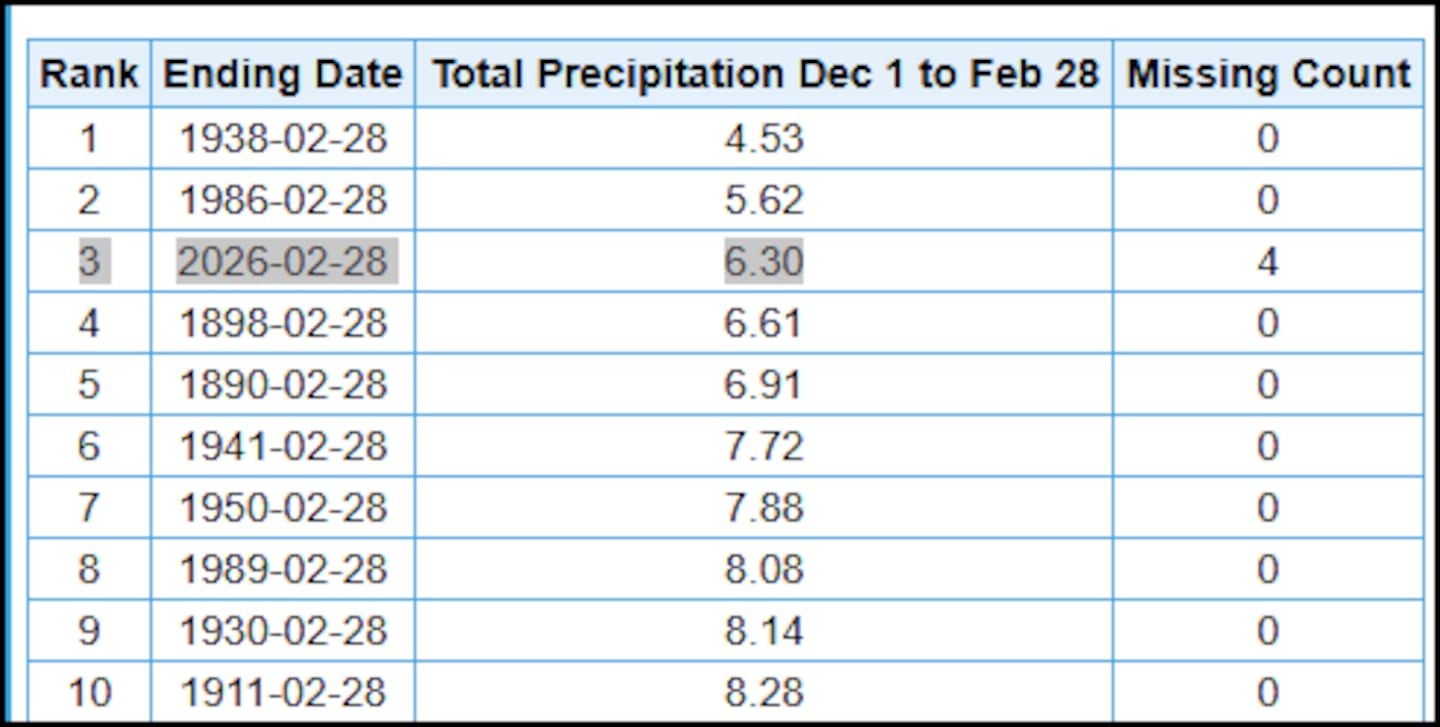 On average, Winter is the Wettest Season for Metro Atlanta.... but not this “year”. Instead, we are experiencing the 3rd Driest Winter, though this standing may improve to a Top 10 Driest Winter after tomorrow’s rain.
