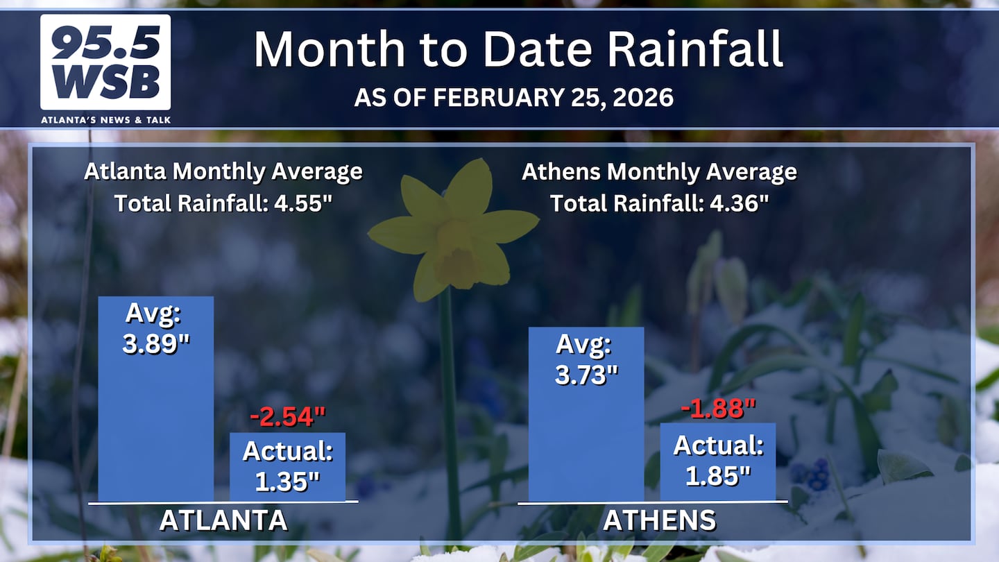 Month to date, Metro Atlanta is experiencing a Top 10 Driest February! With only 1.35″ of rain registered at the Airport, only 36% of the monthly rainfall has fallen so far since the first of the month.