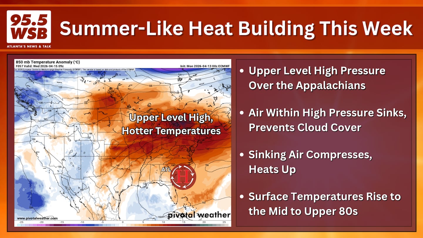 The average afternoon high in Atlanta for mid-April is 73 degrees, but instead, the forecast calls for daytime highs in the mid to upper 80s.