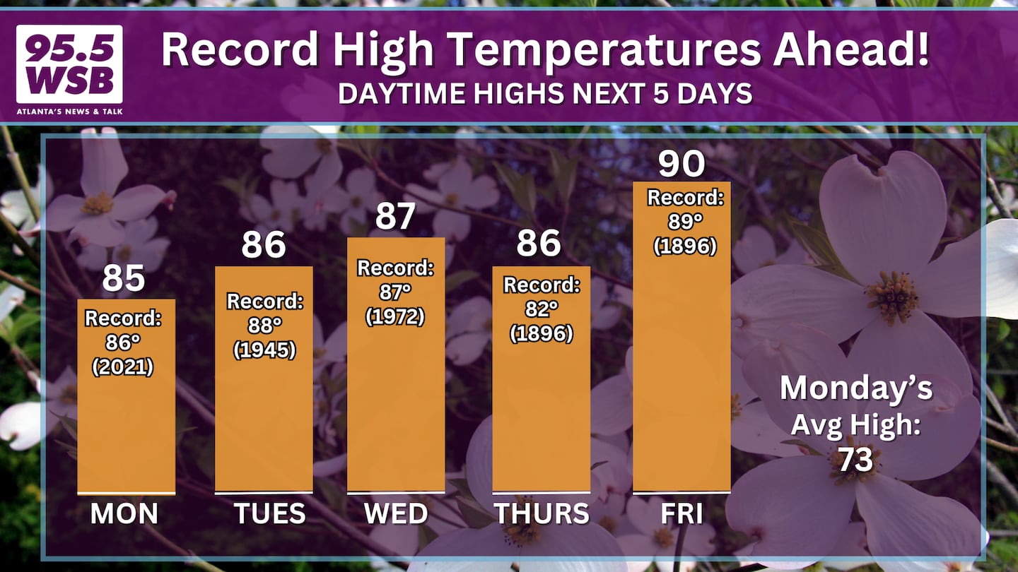 Friday is rather notable, as the record high is 89 degrees for that date. The current forecast calls for afternoon temperatures to climb to 90 degrees, which would not only break the record high for the day but also potentially break the record for the earliest 90 degree day in Metro Atlanta.