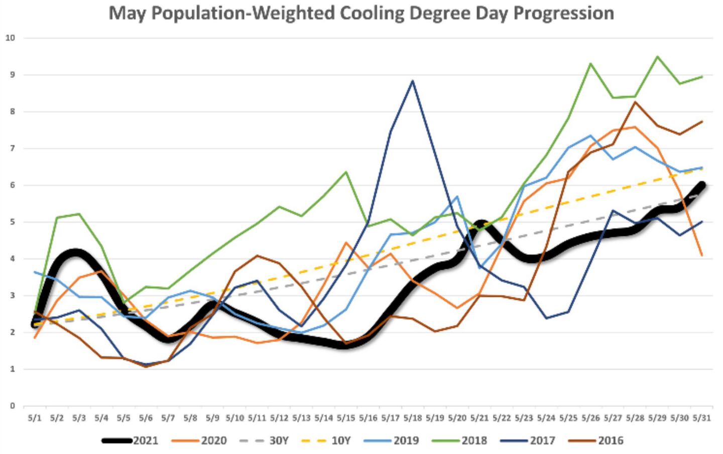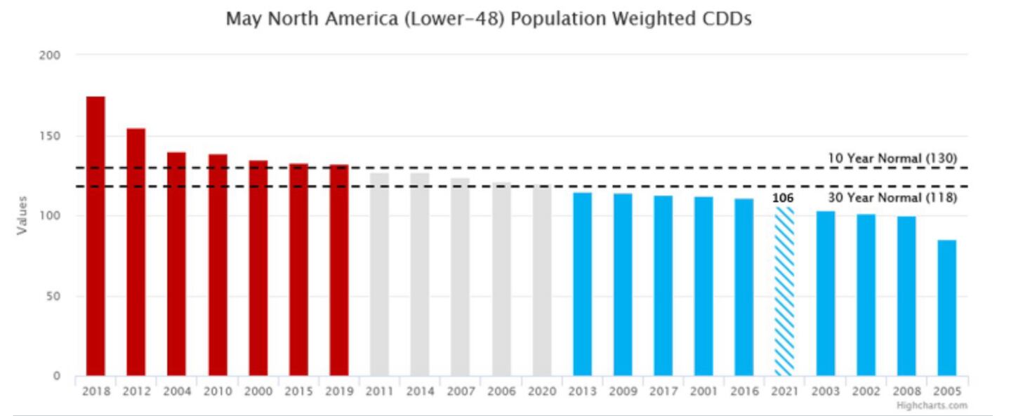 On a nationwide basis one of the lowest May cooling energy demands since 2000: