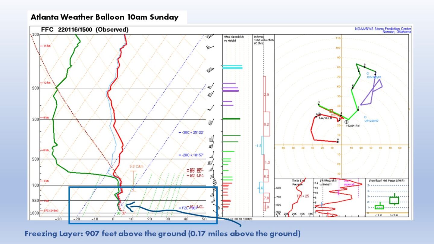 Over Metro Atlanta at 10am Sunday, the air was below freezing until about 900 feet above the ground. That’s why the snow was able to fall even though the air temperature was above freezing -- the snowflakes were melting but surviving the 900 feet of 33-37 degree temperatures.
