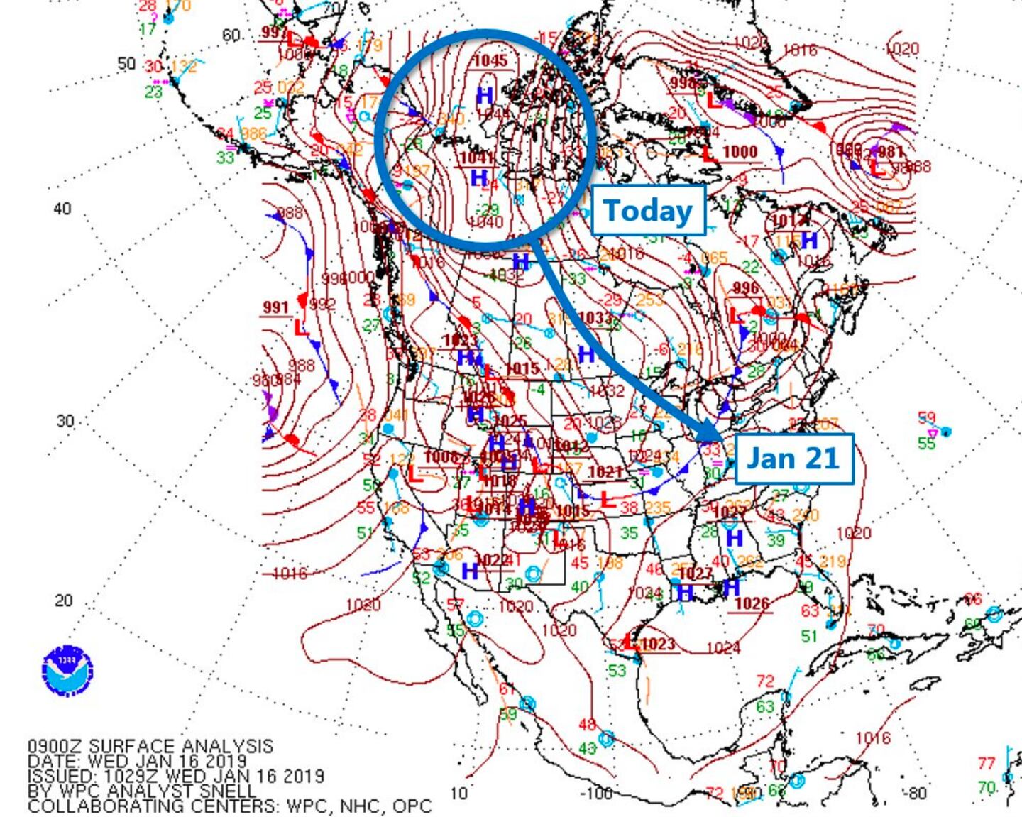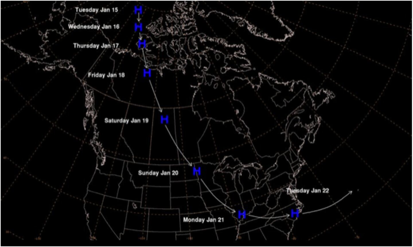 As that surface low pressure system and strong cold front sweep through turning into a Nor’easter snow and ice storm for the Midwest and Northeast states it drags down a high pressure polar air mass into early next week:
