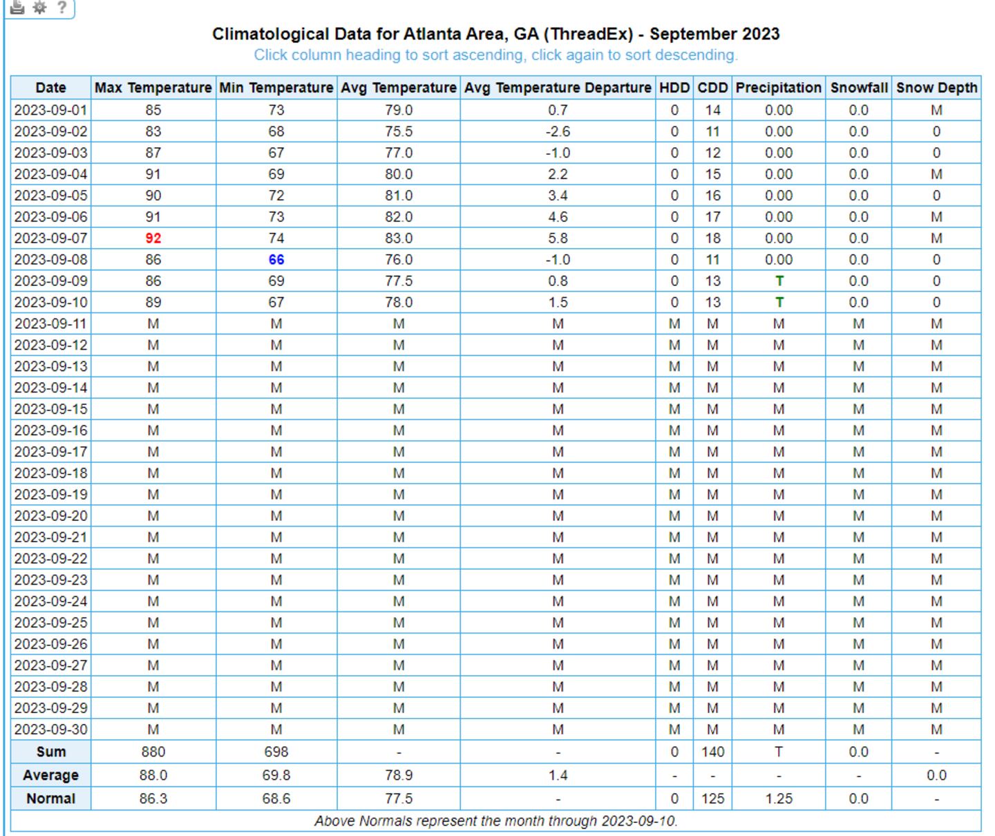 Taking a look at the actual highs and lows in Atlanta for the first week and a half in Atlanta, temperatures are running about 1.5 degrees above average, with afternoon highs still climbing into the upper 80s and low 90s.