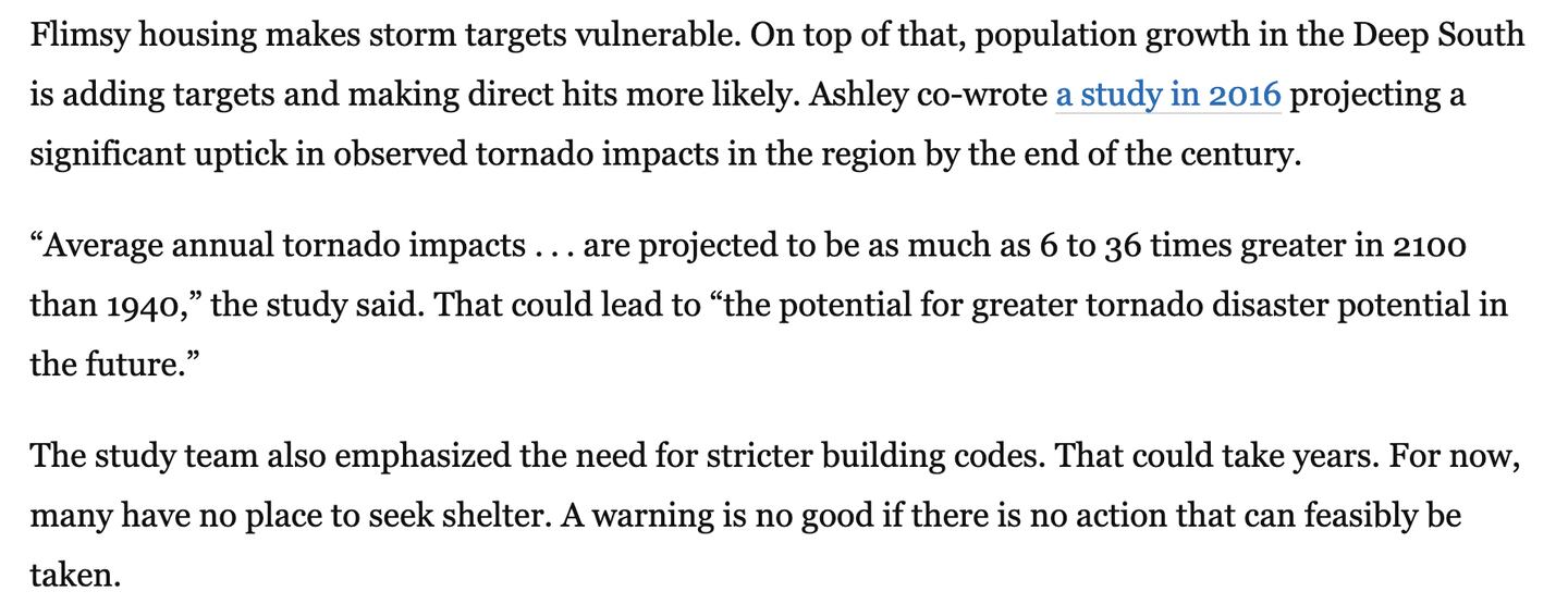 I covered some of this in my previous blog on last Sundays tornado outbreak. A sad mix of meteorology, terrain, topography, poverty and lax rules make many in the South extra vulnerable to tornadoes.