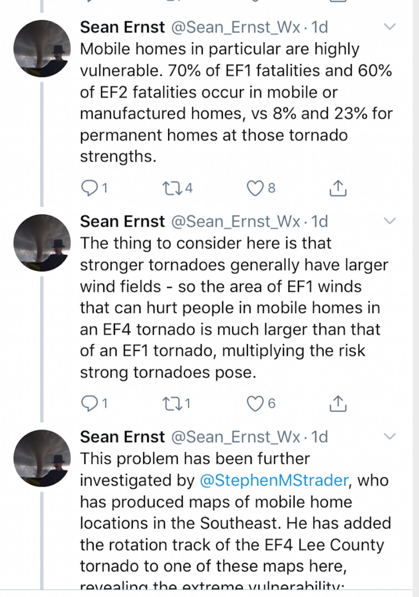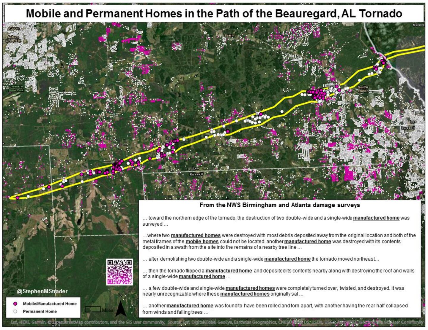 The Southern U.S. has an outsized number of mobile homes and trailer parks adding to population risk from a tornado. Most do not have a tornado cellar or designated safe shelter building, economics and lack of legal requirements are the reasons.