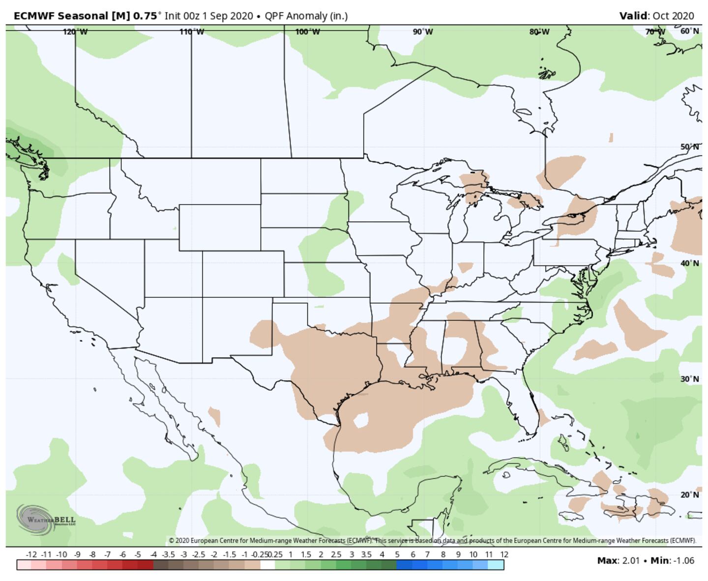 For the MONTH OF OCTOBER the European Model is warmer than the American numerical variants, but they agree on drier than normal: